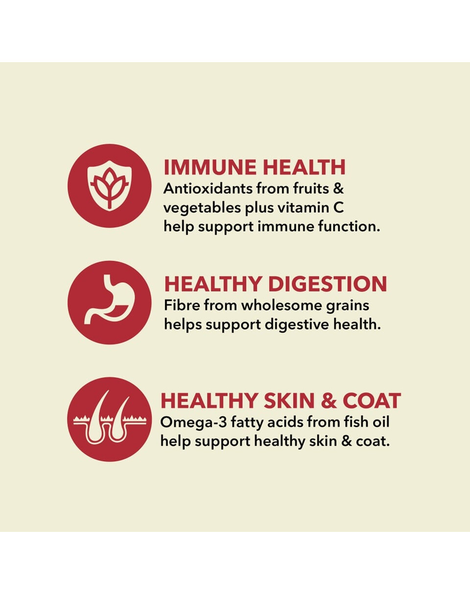 De toevoeging van fruit, groenten en kruiden verbetert de smaak en de smaak van het voer. Appels, pompoen, cranberry's en bosbessen leveren natuurlijke vitamines en antioxidanten ter ondersteuning van het immuunsysteem. Acana gerst is een natuurlijke bron van vezels en bèta-glucanen. Gerst levert vitamine B1 (thiamine), ijzer, magnesium, selenium, fosfor, zink, koper en mangaan.