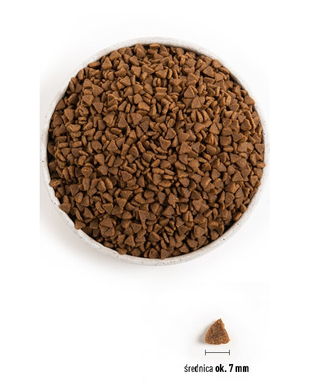 Ruw eiwit 37 %, Ruw vet 18 %, Ruwe vezels 4 %, Ruwe as 10 %, Vocht 10 %, Calcium 1,7 %, Fosfor 1,1 %, Magnesium 0,1 %, Taurine 0,1 %, Omega-6 2,8 %, Omega-3 0,9 %, DHA / EPA 0,2 % / 0,15 %