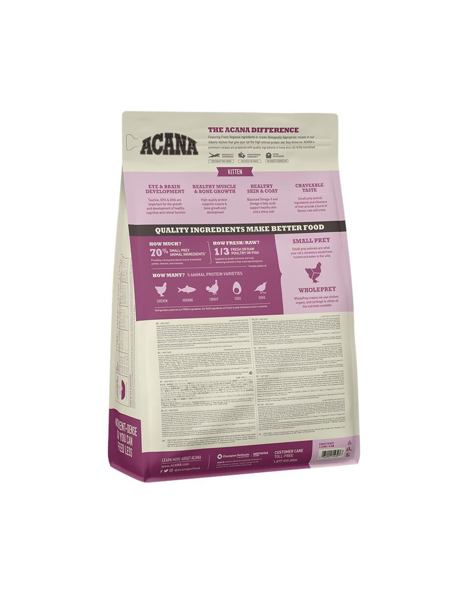 Dit heerlijke voer van Acana biedt uw kitten de optimale start die het verdient. Op het menu staan verse scharrelkip en haring. De kittenvoeding draagt bij aan de ontwikkeling van een gezonde huid en een gezonde vacht. Bovendien ondersteunt het kattenvoer de botontwikkeling en helpt het bij de ontwikkeling van de hersenen.