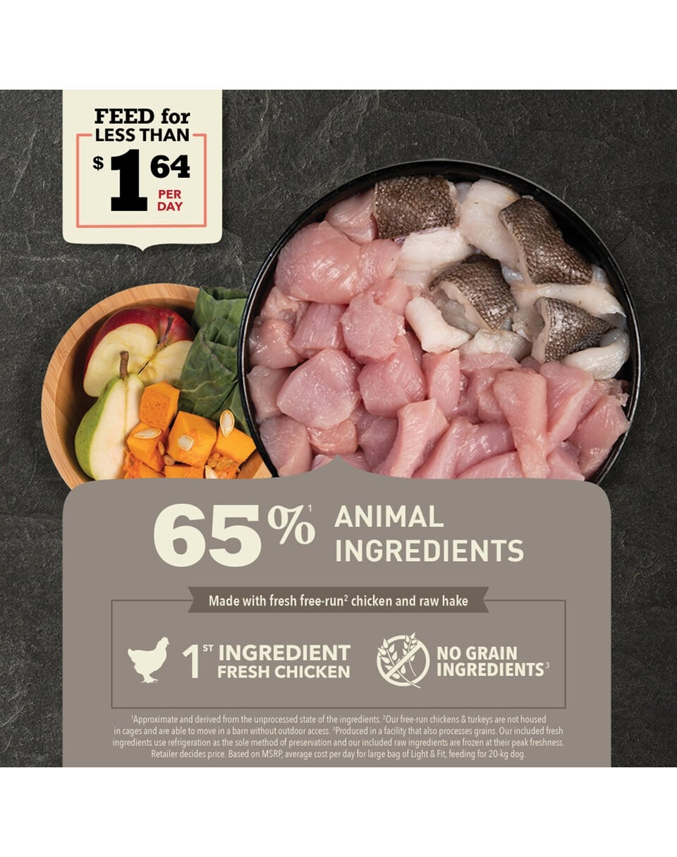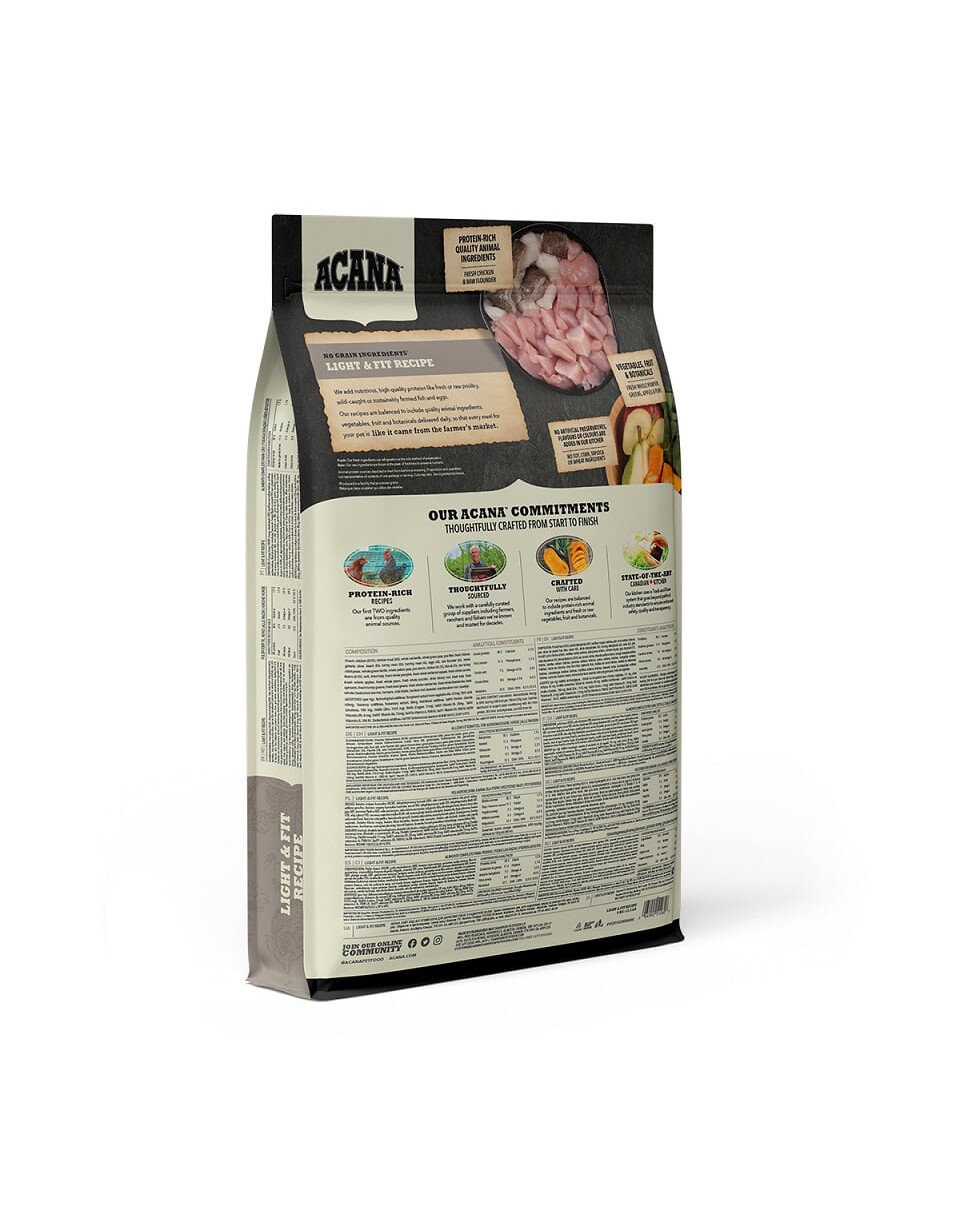 Daarom is onze Acana Light & Fit, met vrijlopende kippen, wild gevangen schol en hele nest-eieren uit onze regio, ongeëvenaard in voedingsstoffen en smaak, gevuld. Om een gezonde bloedsuikerspiegel te bevorderen, is Acana vrij van hoge glycemische ingrediënten zoals rijst, maïs of aardappelen, en in plaats daarvan gevuld met verse, lage glycemische vruchten en groenten, waaronder hele pompoen en butternutpompoen.
