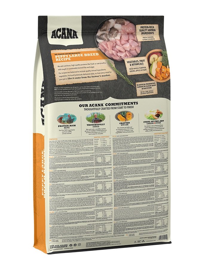 Vers kippenvlees (22%), gedehydrateerd kippenvlees (21%), hele rode linzen, hele groene erwten, verse kippenorganen (lever, hart) (6%), gedehydrateerde haring (4%), eieren (4%), rauwe schol (4%), visolie (4%), hele kikkererwten, erwtenvezels, erwtenzetmeel, gedroogde kalkoen (2,5%), hele groene linzen, hele gele erwten, kippenvet (2%), rauwe kalkoenenlever (0,5%), zout, gedroogd zeewier, verse hele appels, verse hele meloenen, verse hele wortelen, verse hele peren, verse hele pompoen, verse hele courgette, verse boerenkool, verse spinazie, verse raapsteeltjes, verse bietenbladeren, verse hele bosbessen, verse hele veenbessen, verse hele Saskatoon-bessen, klitwortel, lavendel, valeriaanwortel, distel, rozenbottels, kurkuma.
