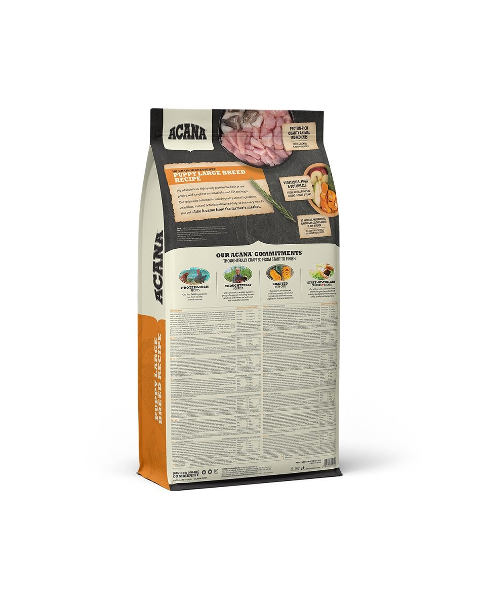 Vers kippenvlees zonder bot (16 %), gedroogd kippenvlees (15 %), gedroogd kalkoenvlees (14 %), rode linzen, hele, groene erwten, verse kippenorganen (lever, hart, nieren) (6 %), gedroogde Atlantische haring (4 %), verse, hele eieren (4 %), verse, hele schol (4 %), haringolie (3 %), zon-gerijpt alfalfa (2 %), veldbonen (2 %), groene linzen, hele, gele erwten, erwtenvezels, kippenvet (2 %), verse kippenkraakbeen (2 %), bruine zeewier, verse pompoen, verse tuinpompoen, verse pastinaak, verse groenten, verse spinazie, verse, bruine mosterd, verse raapzaadbladeren, verse wortelen, verse “Red Delicious” appels, verse “Bartlett” peren, diepgevroren kippenlever, diepgevroren kalkoenenlever, verse, hele cranberries, verse, hele bosbessen, cichoreiwortels, kurkuma, mariadistel, grote klitwortels, lavendelbloemen, echte hibiscuswortels, rozenbottels. ADDITIEVEN (per kg): Voedingssupplementen: E6 (Zink): 100 mg. Voedingsfysiologische additieven: Enterococcus faecium