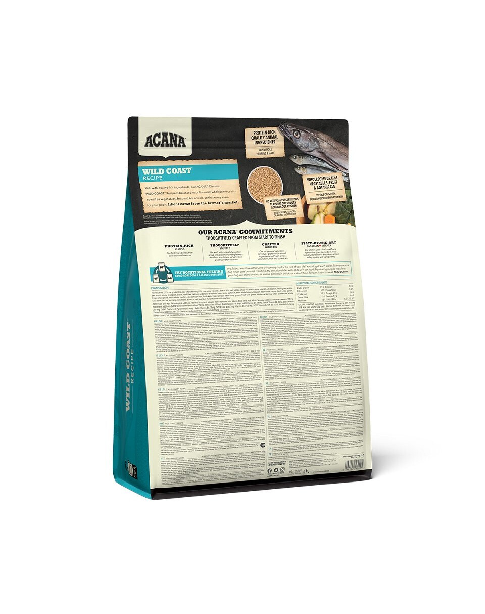 Getrockneter Hering (24%), geschroteter Hafer (23%), frischer ganzer Hering (10%), frische ganze Flunder (6%), Heringsöl (6%), Rapsöl, frischer ganzer Silberhecht (4%), rote Linsen, ganze grüne Erbsen, grüne Linsen, ganze “Garbanzo”-Bohnen, ganze gelbe Erbsen, ganzer Hafer, sonnengereiftes Alfalfa, Linsenfasern, brauner Seetang, frischer Kürbis, frischer Gartenkürbis, frische Pastinaken, frischer Gemüsekohl, frischer Spinat, frische Möhren, frische “Red Delicious”-Äpfel, frische „Bartlett“-Birnen, gefriergetrockneter Hering (0,1%), frische Cranberries, frische Heidelbeeren, Chicoréewurzeln, Kurkuma, Mariendistel, grosse Klettenwurzeln, Lavendel, echte Eibischwurzeln, Hagebutten.