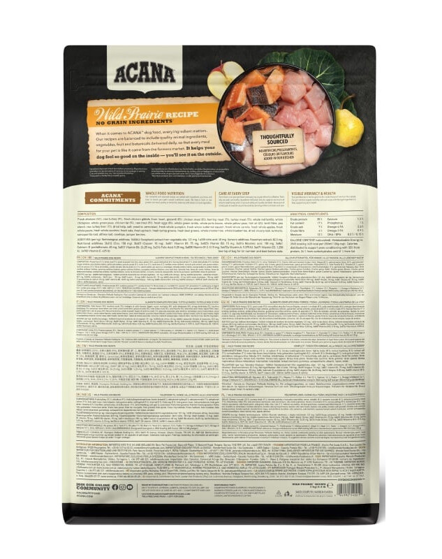Gedroogd kippenvlees (25%), gemalen haver (23%), vers kippenvlees (5%) verse kippenorganen (lever, hart, nieren) (5%), rode linzen, hele groene erwten, groene linzen, vers kalkoenvlees (4%), verse hele eieren (4%), kippenvet (4%), hele “Garbanzo”-bonen, hele gele erwten, hele haver, haringolie (3%), zonnebloem-alfa-alfa, linzenvezels, bruine zeewier, verse pompoen, verse tuinpompoen, verse pastinaak, verse boerenkool, verse spinazie, verse wortelen, verse “Red Delicious”-appels, verse “Bartlett”-peren, diepvriesgedroogde kippenlever (0,1%), zout, verse cranberries, verse bosbessen, cichoreiwortels, kurkuma, mariadistel, grote kliswortels, lavendel, echte hibiscuswortels, rozenbottels.