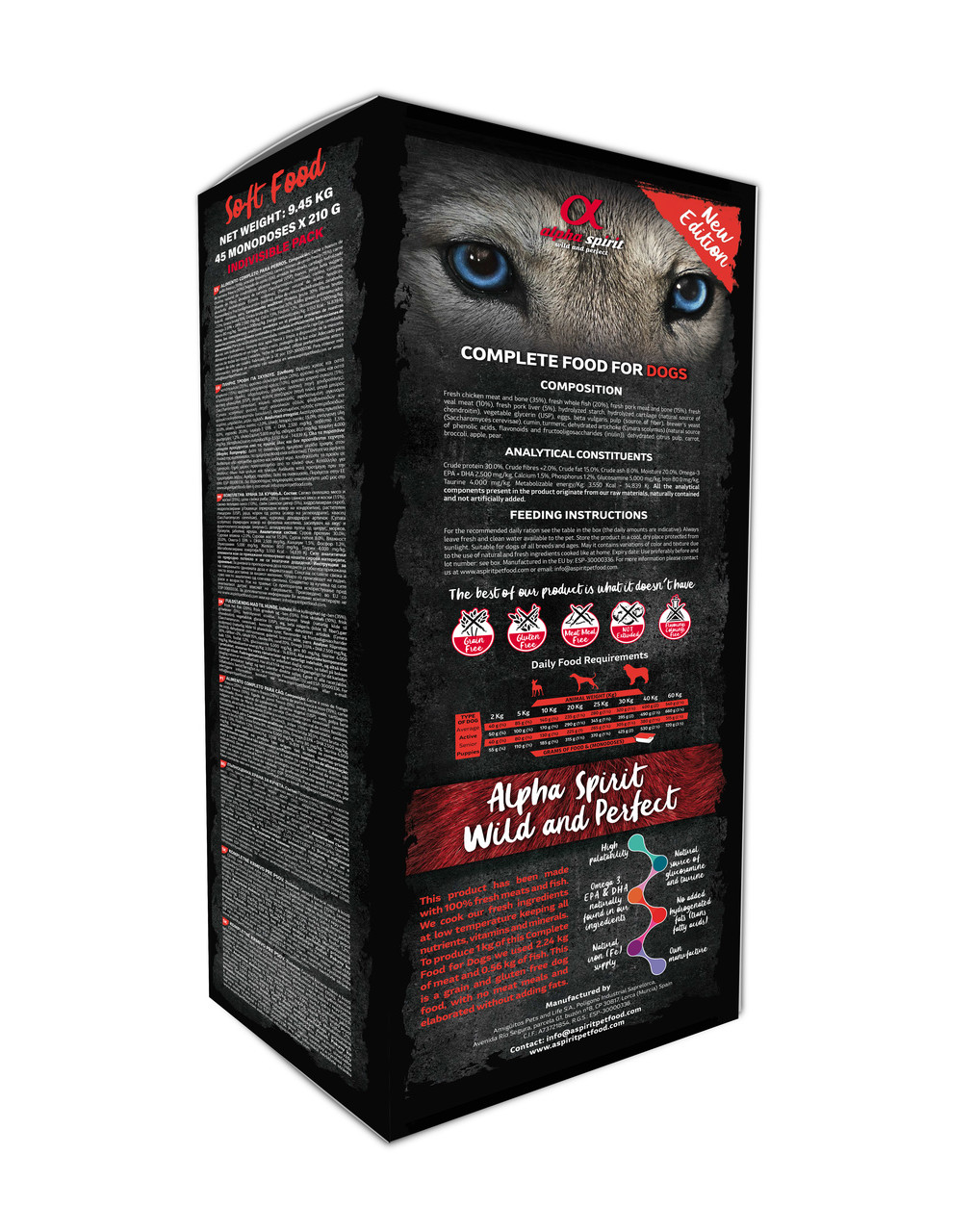 Das Rezept basiert auf frischem Fleisch und frischem Fisch. Im Futter wurden verschiedene Fleischsorten in unterschiedlichen Anteilen verwendet, z. B. Truthahn, Schweinefleisch, Ente. Die verschiedenen Fleischsorten liefern alle Zutaten. Die unterschiedlichen Mengenverhältnisse entsprechen den natürlichen Bedürfnissen und gehen auf die Wurzeln der Ernährung des Hundes zurück. Frisches Obst und Gemüse sowie Kräuter werden hinzugefügt. Glucosamin und Chondroitin unterstützen das Skelettsystem.