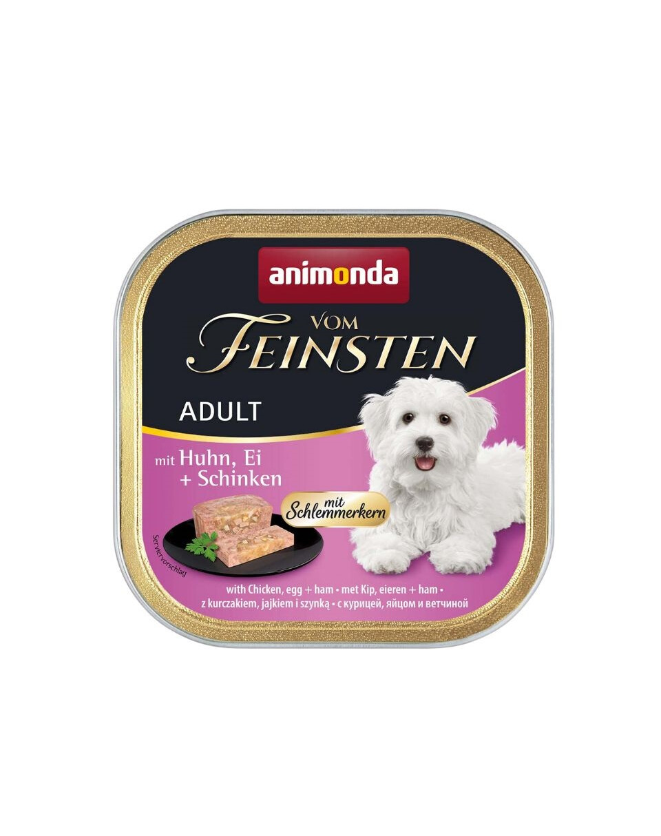 Vom Feinsten Adult met Schlemmerkern staat voor evenwichtige, lekkere gezonde voeding op het hoogste niveau voor volwassen honden van 1 - 6 jaar. De kwaliteit van de vlees ingrediënten gecombineerd met een kern van geselecteerde fijnproever ingrediënten garandeert een unieke smaakbeleving. De fijn-stukjes paté voorzien de volwassen hond van alle levensbelangrijke voedingsstoffen.