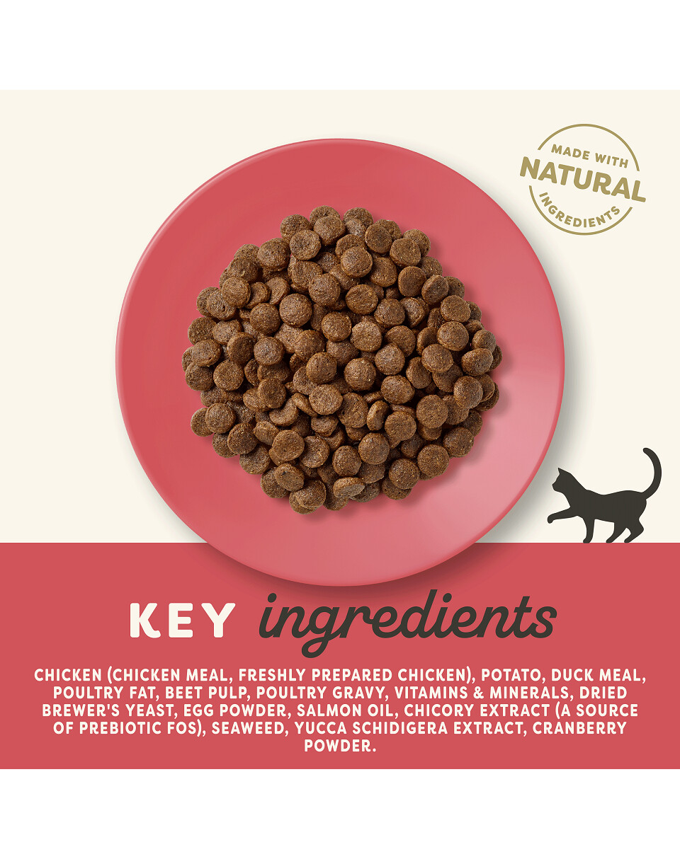 Kippenmeel (47 %), eendenmeel (21 %), vers gemalen gevogelte (16 %), aardappelen, suikerbietenpulp, biergist, gevogelte-saus (1 %), zalmolie, vitamines en mineralen, gedroogde eieren, cellulosevezel van plantaardige oorsprong (0,03 %), natriumchloride, calciumcarbonaat, algen, cranberry, DL-methionine, kaliumchloride, yucca-extract, citrusvruchtenextract, rozemarijnextract