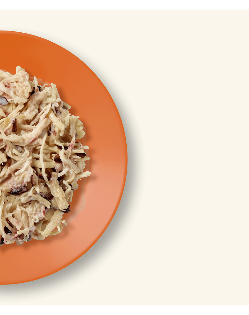 Kip met pompoen: Kipfilet (50%), pompoen (25%), kippenbouillon (24%), rijst (1%).