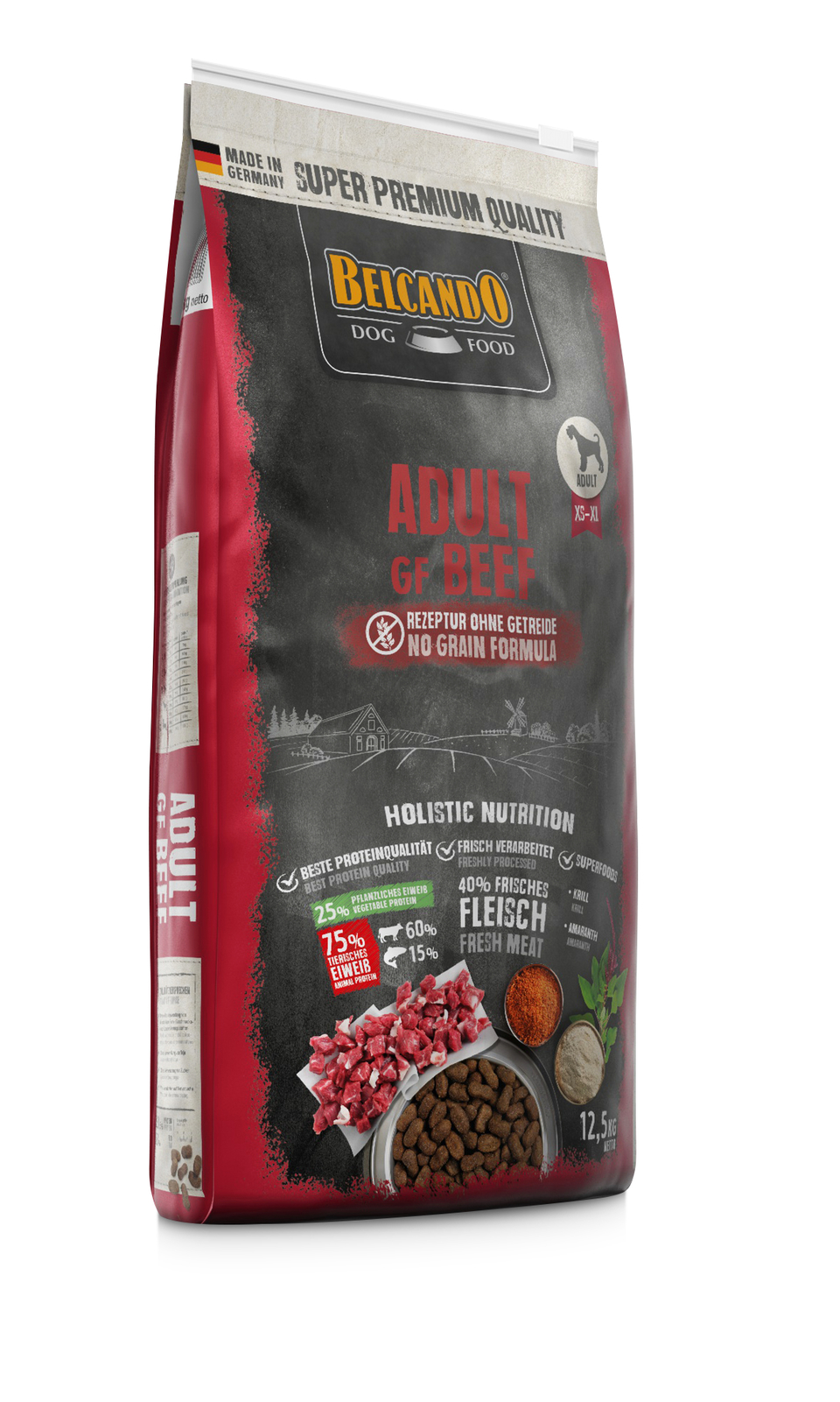 De ideale voeding voor honden met voedselintoleranties tegen gluten of granen, die een alternatief voor gevogelte verkiezen. In de volgens een holistisch voedingsconcept ontwikkelde receptuur wordt het graan vervangen door hoogwaardige amarant, die aanzienlijk hogere gehaltes aan belangrijke voedingsstoffen (eiwit, essentiële aminozuur lysine, onverzadigde vetzuren, mineralen, sporenelementen) heeft. Het hoge versvleespercentage maakt Adult GF Beef bovendien tot een waar genot, zelfs voor kieskeurige honden. Het gehalte aan eiwit en vet is afgestemd op de behoeften van volwassen honden van alle rassen met een normale activiteit.Aandeel dierlijk eiwit aan het totale eiwit: 75 % (uit rund 60 %, uit vis 15 %)SamenstellingVers rundvlees (40 %); Amarant (18 %); Aardappelzetmeel; Rundereiwit, gedroogd (12,5 %); Erwtmeel; Vismeel van zeevissen (2,5 %); Zee-zoöplankton, gemalen (Krill, 2,5 %); Biergist, gedroogd; Johannesbroodschroot, gedroogd; Druivenpitperskoek; Dicalciumfosfaat; Bietendroogsnippers, ontzoet; Zalmolie; Distelolie; Gisten, gehydrolyseerd; Chiazaad; Natriumchloride; Kaliumchloride; Kruiden, gedroogd (totaal: 0,2 %; Brandnetelbladeren, Gentiaanwortel, Duizendguldenkruid, Kamille, Venkel, Komijn, Mistletoe, Duizendblad, Braambladeren); Yucca schidigeraAnalytische bestanddelenEiwit 23,5 %; Vetgehalte 13 %; Ruwe as 7,0 %; Ruwe vezel 3,5 %; Vocht 10,0 %; Calcium 1,3 %; Fosfor 1,0 %; Natrium 0,35 %Toevoegstoffen per KGVoedingsfysiologische toevoegstoffen:Vitamine A 13.000 I.E.; Vitamine D3 1.300 I.E.; Vitamine E 130 mg; Taurine 500 mg; Koper (als Koper(II)sulfaat, Pentahydraat) 12,5 mg; Ijzer (als Ijzer(II)sulfaat, Monohydraat) 200 mg; Mangaan (als Mangaan(II)oxide) 40 mg; Zink (als Zinkoxide) 125 mg; Jodium (als Calciumjodaat, watervrij) 2 mg; Selenium (als Natriumseleniet) 0,05 mgTechnologische toevoegstoffen:Tocopherolextracten uit plantaardige oliën (= natuurlijk vitamine E) 48 mg