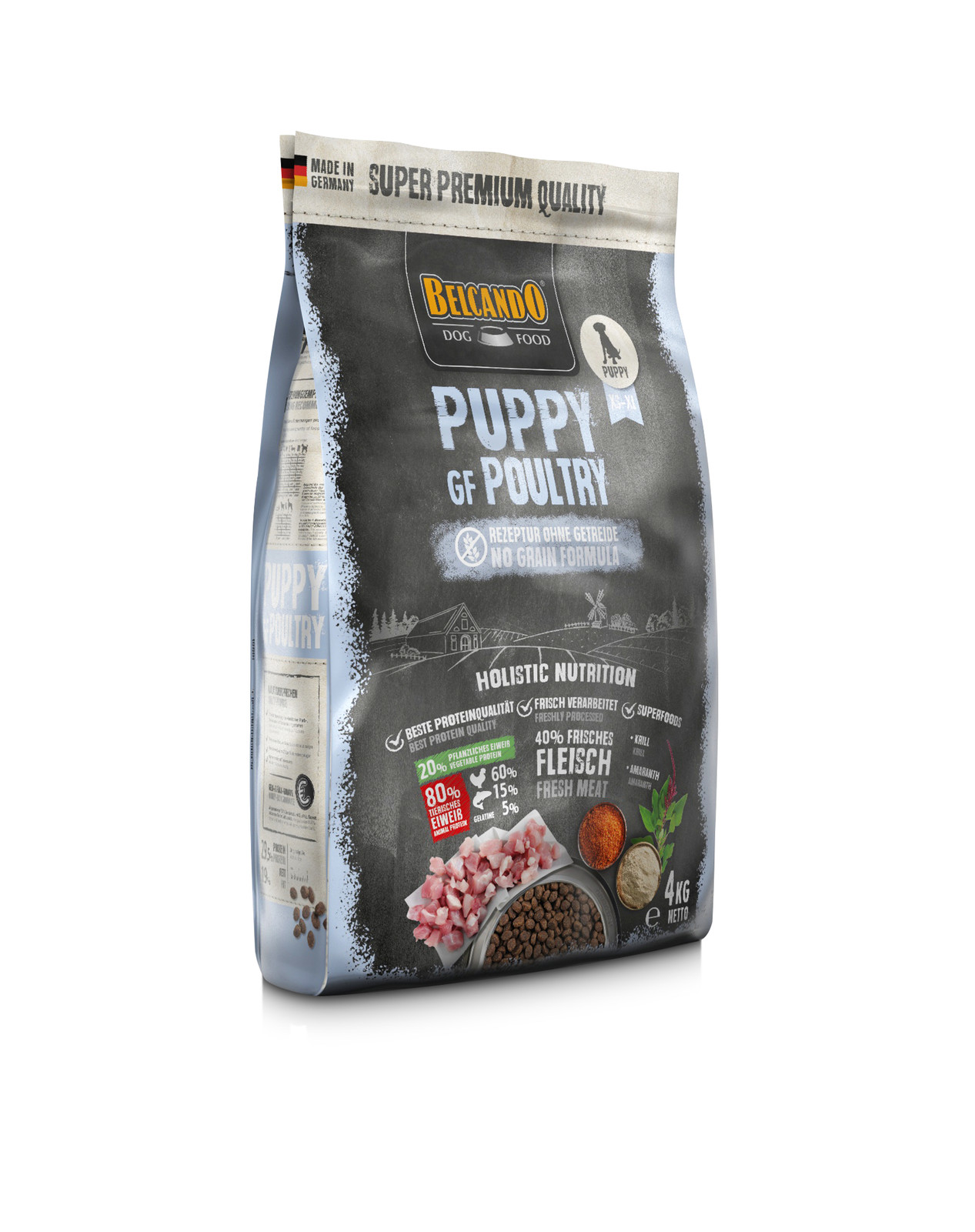 Veel fokkers en puppy-eigenaren hechten veel waarde aan een graanvrije voeding voor hun honden. Daarom is het belangrijk om vanaf het begin de juiste receptuur te kiezen. Extra veel vers gevogelte en zorgvuldig geselecteerde grondstoffen maken BELCANDO® Puppy GF Poultry bijzonder goed verteerbaar. Granen worden in deze receptuur vervangen door hoogwaardige amarath - een ideale leverancier van belangrijke voedingsstoffen.