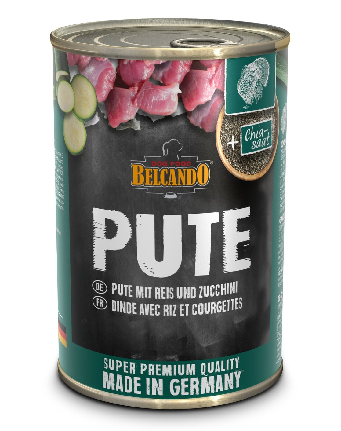 Kalkoenvlees, -lever, -hart, -maagspier (63 %); Vleesbouillon van kalkoen (26,5 %); Rijst, gekookt (4 %); Courgette (4 %); Chiazaad (1 %); Eierschalen, gedroogd (0,5 %); Mineralen (0,5 %); Distelolie (0,5 %)