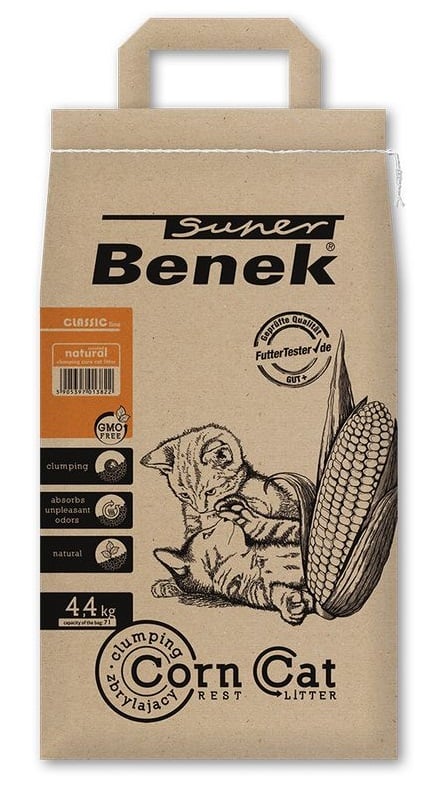 Super Benek Corn Cat Natural is een innovatieve kattenbakvulling die voor 100% uit natuurlijk, plantaardig materiaal is vervaardigd. Daarbij worden ook geen chemische toevoegingen gebruikt, waardoor dit product composteerbaar en biologisch afbreekbaar is en gemakkelijk via het toilet kan worden weggegooid. Dankzij de enorme absorptiekracht worden vloeistoffen snel opgenomen en vormt de vulling compacte, platte klonten. Dit maakt het eenvoudig en comfortabel om de kattenbak schoon te maken.
