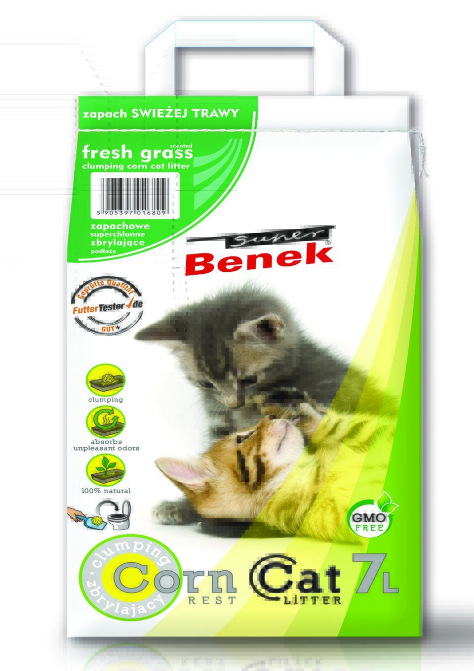 Benek CORN kattenbakvulling is een product van de nieuwe generatie, dat is gemaakt van natuurlijk plantaardig materiaal en zonder chemische toevoegingen. Het is zeer efficiënt (ideaal voor eigenaren van meerdere katten) en "zweeft" niet buiten de kattenbak. Bovendien absorbeert het zeer effectief geuren, klontert het en is het gemakkelijk weg te gooien. Het kan in het toilet worden weggegooid en is biologisch afbreekbaar (ook de verpakking). De substraten van de Super Benek CORN-serie zijn veilig voor de kat als ze het inslikken.