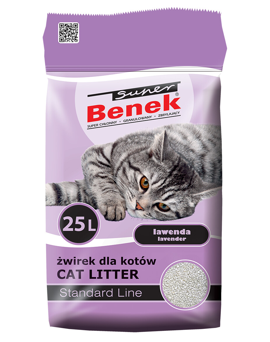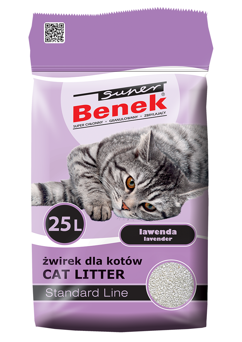 Super Benek kattenbakvulling kenmerkt zich door regelmatige, grove korrels van 2-5 mm die de beste bescherming bieden tegen het verspreiden van de vulling. Het absorbeert zeer effectief vloeistoffen en geuren en biedt een goede antibacteriële bescherming. Klonters samen tot regelmatige, compacte klonten. Droog, licht en warm - voelt aan alsof het verwarmd is en biedt uw huisdier comfort. Hoog absorberend, stofvrij, plakt niet aan de bodem van de kattenbak.
