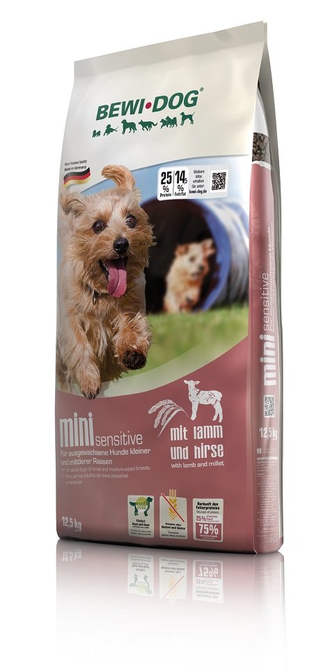Onze nieuwe variant: BEWI DOG® mini sensitive voor volwassen honden van kleine en middelgrote rassen zoals terriers, Maltezer, teckel of mopshond. Extra kleine voederdeeltjes met goed verteerbaar lam en gierst.