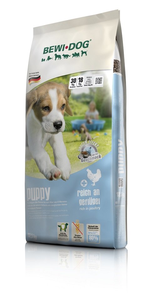BEWI DOG® puppy is het uitgebalanceerde opfokvoer voor puppy's tot vier maanden oud. Met zijn aangepaste energie- en voedingswaarde is het ook geschikt voor jonge honden van kleine en middelgrote rassen. Met sauzen-effect - bij het aanroeren met warm water ontstaat er een lekkere saus op de voederdeeltjes.