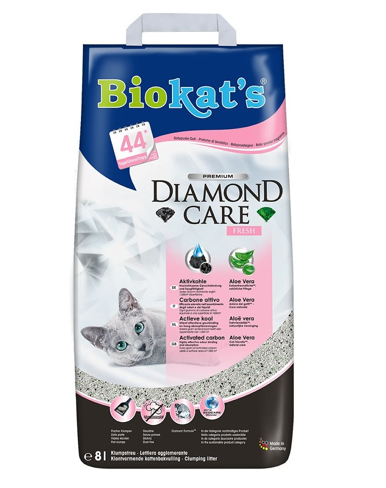 Biokat's Diamond Care Fresh kattenbakvulling Deze kattenbakvulling bevat puur natuurlijke actieve kool voor zeer effectieve geurbinding en Aloe Vera voor extra verzorging. Het biedt een extra, zeer effectieve bescherming tegen onaangename geuren door puur natuurlijke actieve kool, die is gemaakt van de hernieuwbare grondstof kokosnoot. Actieve kool is een hoogporositeit vorm van koolstof met een groot intern oppervlak. Specificaties: Kleur: grijs Geslacht: unisex Materiaal: plantaardig Gewicht: 7kg Inhoud: 8 liter