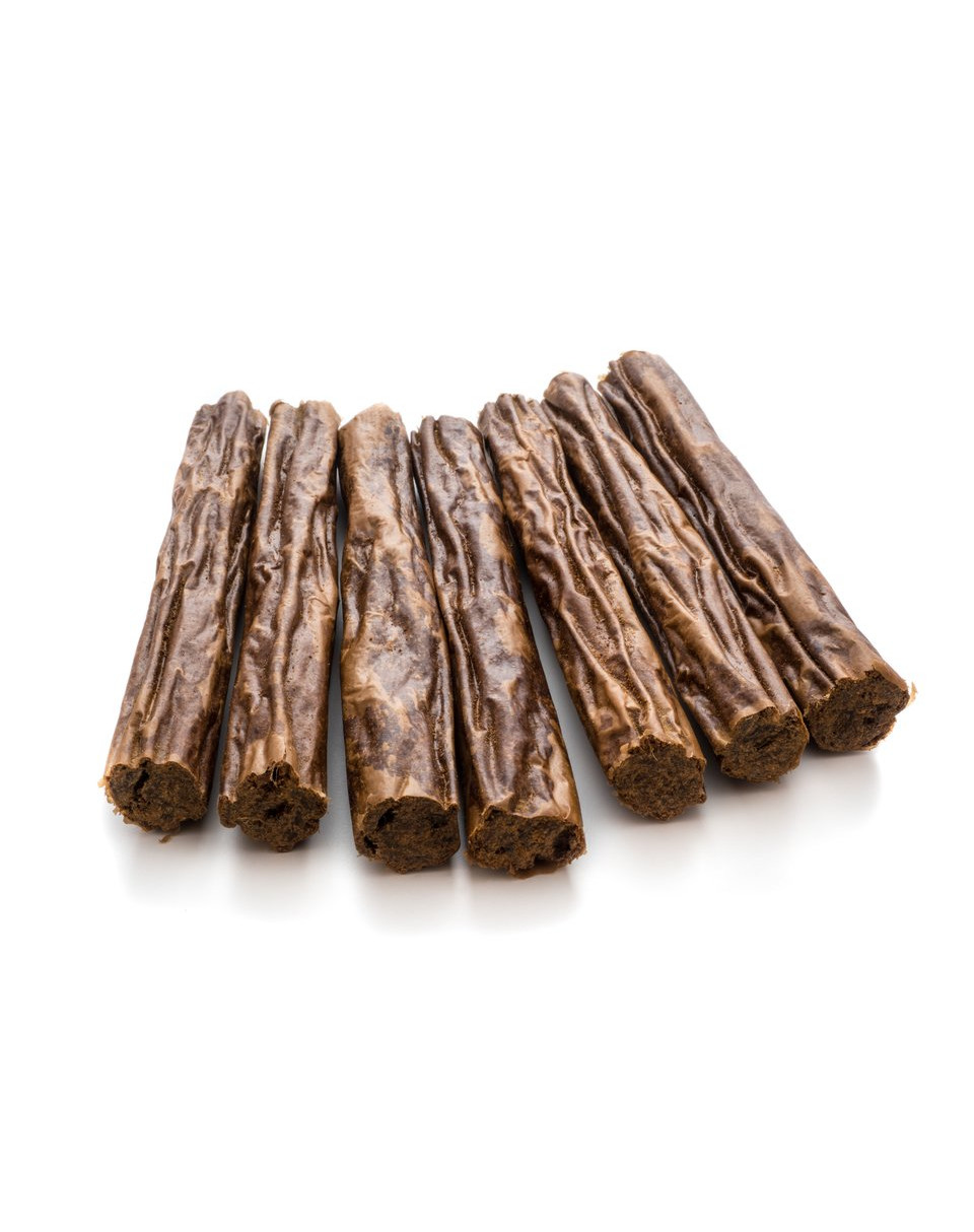 Leckerbissen in de vorm van zachte honden-zigarren. Ze zijn voor 98% gemaakt van wildschweinfleisch, met toevoeging van collageen, dat de juiste vorm van de lekkernij behoudt.