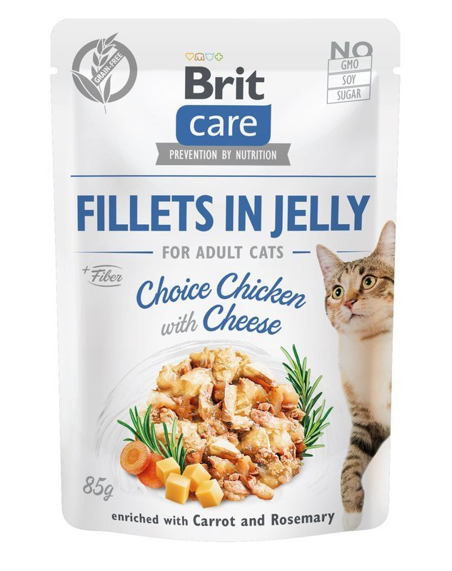 Brit Care Cat Filets in gelei met geselecteerde kip en kaas. Verrijkt met wortelen en rozemarijn. Compleet super-premium natvoer voor volwassen katten.