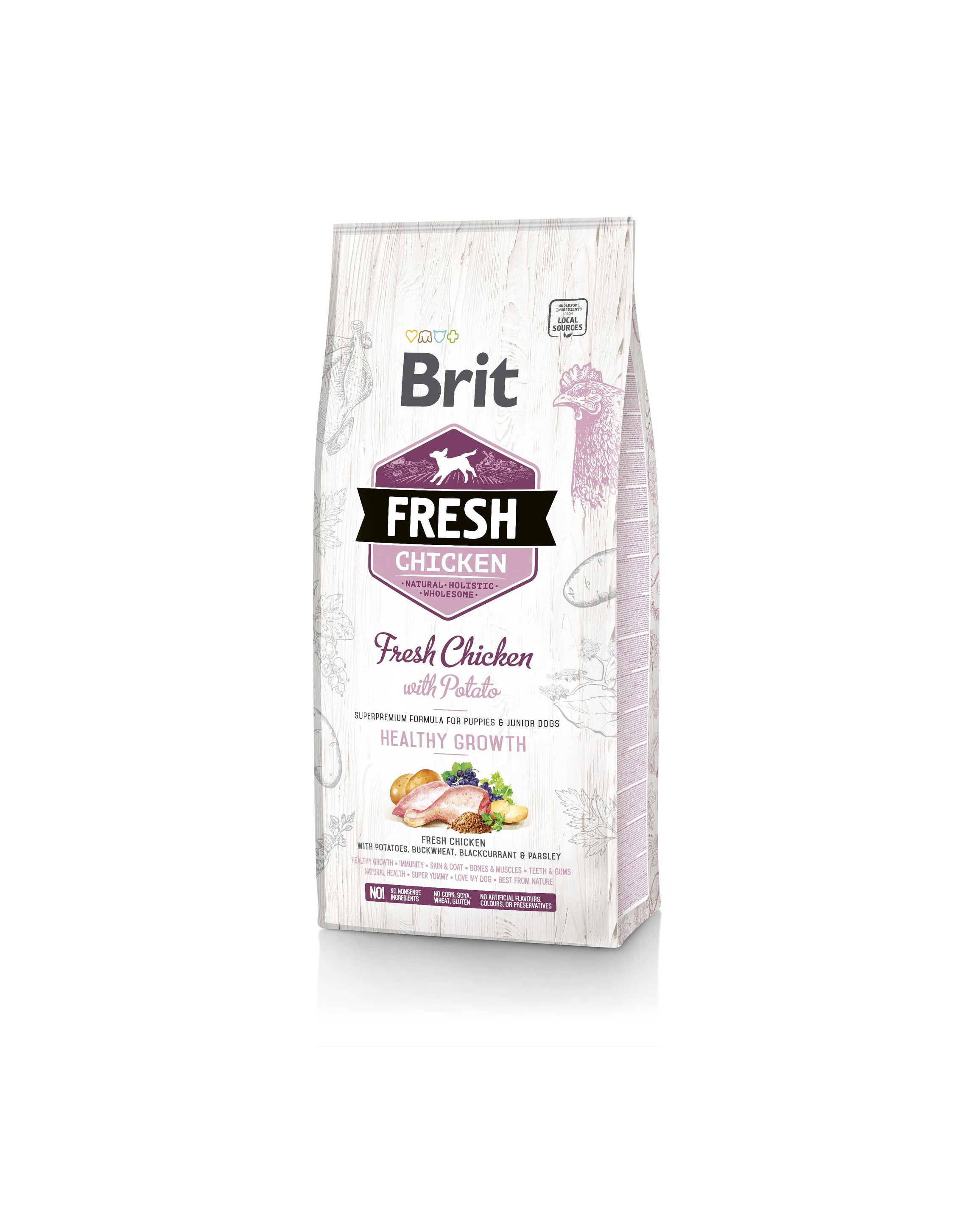 Vers vers vlees van kip met aardappelen, boekweit, zwarte bessen, peterselie. Super-premium hondenvoer voor puppy's en jonge honden. Volledig voer voor honden.