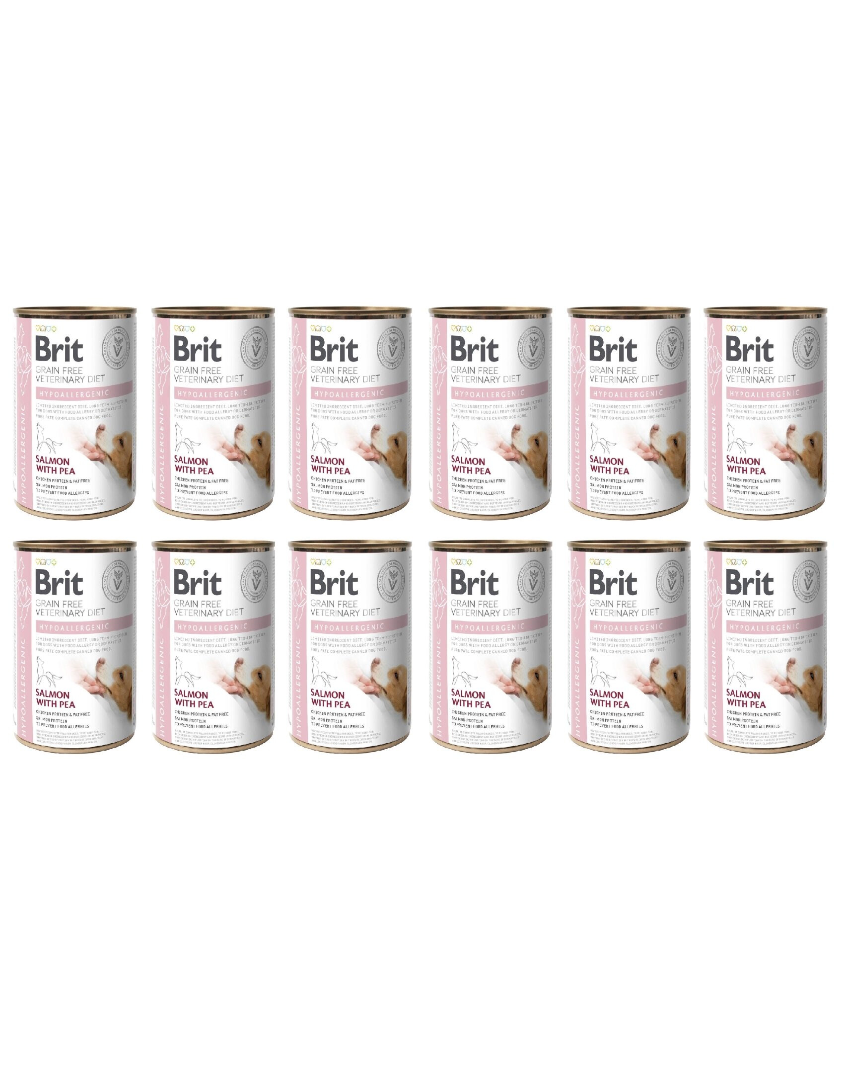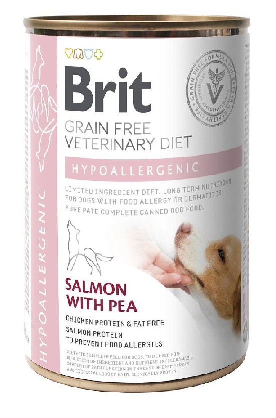Diergeneeskundige volledige voeding met zalm en erwten voor volwassen honden met dermatologische en gastro-intestinale problemen, die voortkomen uit voedselallergieën en -intoleranties.