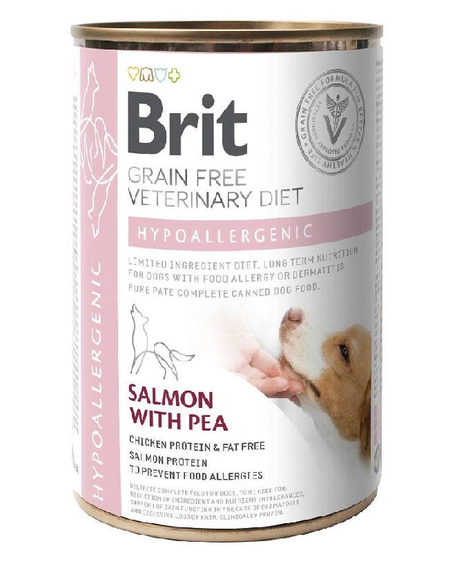 Diergeneeskundige volledige voeding met zalm en erwten voor volwassen honden met dermatologische en gastro-intestinale problemen, die te wijten zijn aan voedselallergieën en -intoleranties.