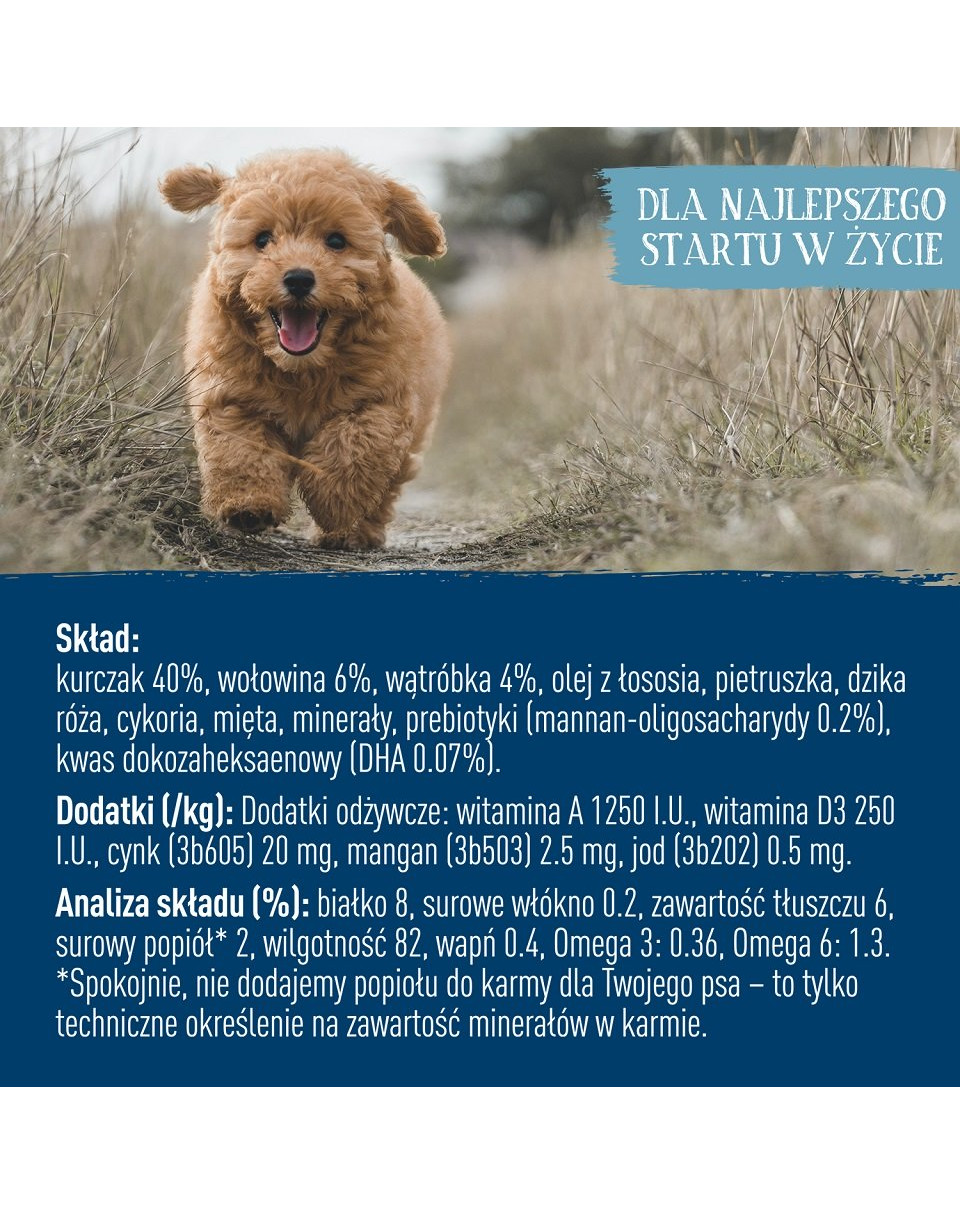 INGREDIËNTEN: Kip 40%, Rund 6%, Lever 4%, Zalmolie, Peterselie, Rozenbottel, Witlof, Munt, Mineralen, Prebiotica (Mannan-oligosacchariden 0,2%), Docosahexaeenzuur (DHA 0,07%)....