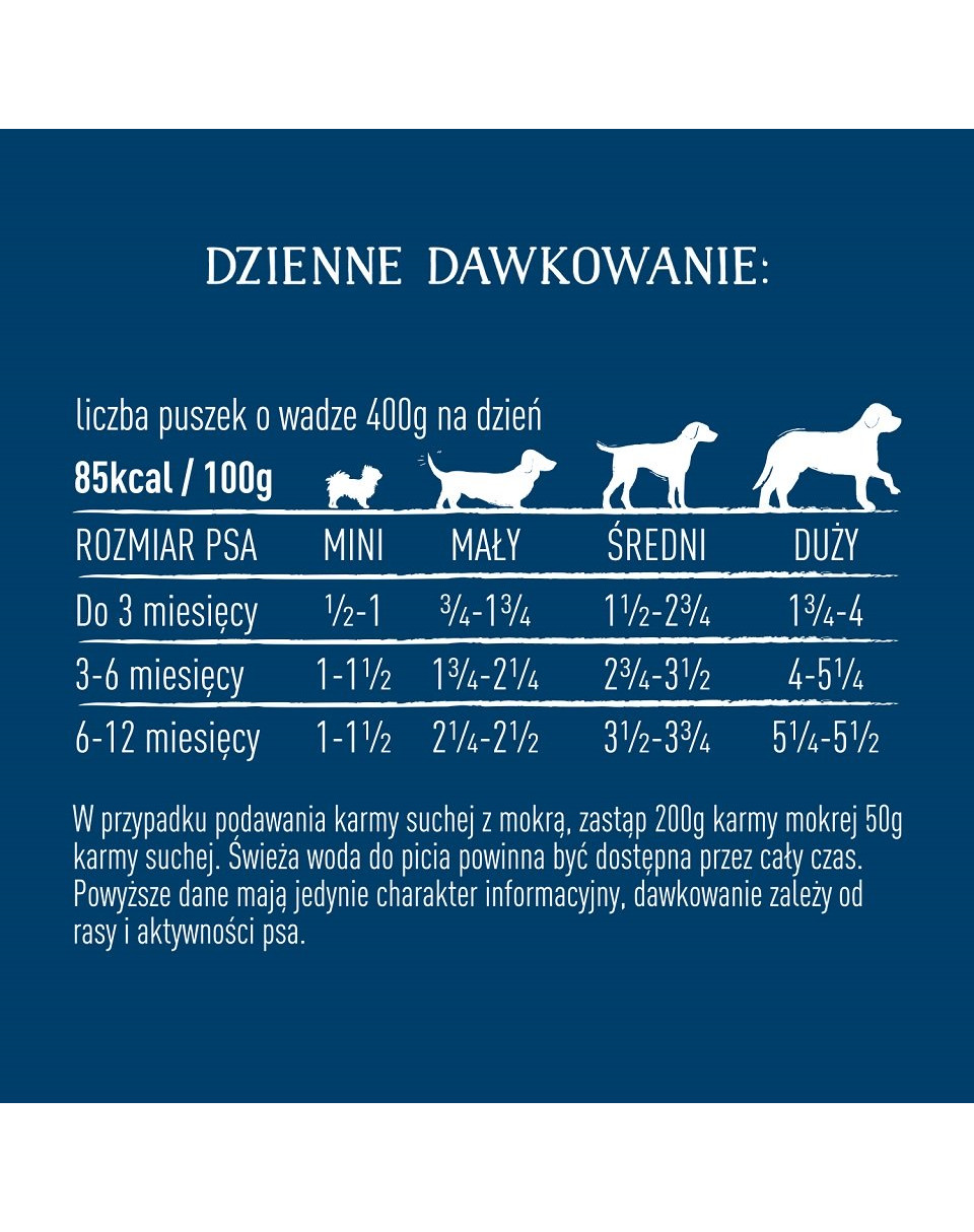 Als u droogvoer met natvoer voert, vervang dan 200 g natvoer door 50 g droogvoer. Vers drinkwater moet te allen tijde beschikbaar zijn. De naaststaande cijfers zijn alleen ter informatie, de dosering hangt af van het ras en de activiteit.