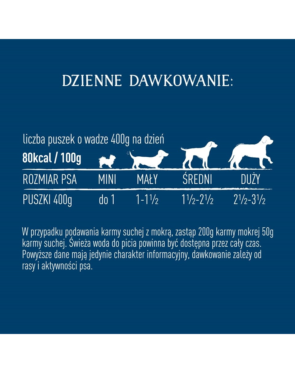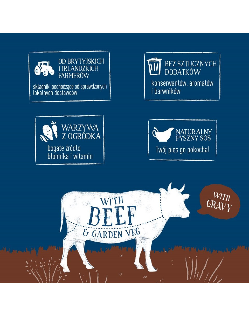 Een compleet hondenvoer in de vorm van sappige rundvleespasteitjes in een smakelijke saus met groenten rechtstreeks uit de tuin. Evenwichtige, graanvrije receptuur op basis van ingrediënten van natuurlijke oorsprong, die uw hond zeker zal bevallen en hem van alle noodzakelijke voedingsstoffen voorziet