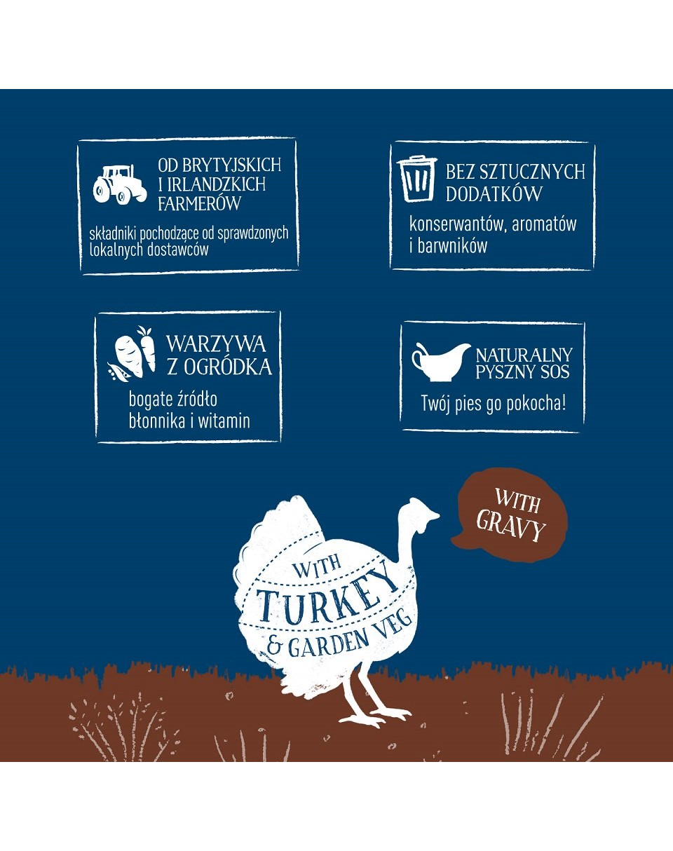 Een compleet hondenvoer in de vorm van sappige kalkoenstukjes in een smakelijke saus met groenten rechtstreeks uit de tuin. Perfect uitgebalanceerde, graanvrije formule op basis van ingrediënten van natuurlijke oorsprong, die uw huisdier zeker zal bevallen en het voorziet van alle noodzakelijke voedingswaarden
