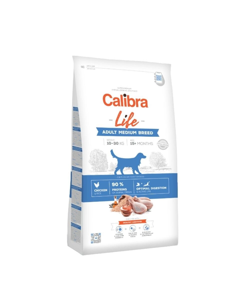 Calibra Dog Life Adult Medium Breed Chicken – Superpremium-Alleintrockenfutter met een hoog percentage kippenvlees voor volwassen honden van middelgrote rassen (10–30 kg). De hypoallergene formule is gebaseerd op hoogwaardige dierlijke eiwitten, die 90 % van het totale eiwitgehalte uitmaken, en een laag graanpercentage (alleen rijst). Dankzij de toegevoegde prebiotica en probiotica worden de voorwaarden voor het opbouwen van een optimale spijsvertering vervuld. Een geselecteerde mix van vitamines en mineralen draagt bij aan de versterking van het immuunsysteem. De formule ondersteunt daarom in aanzienlijke mate een actief hondenleven.
