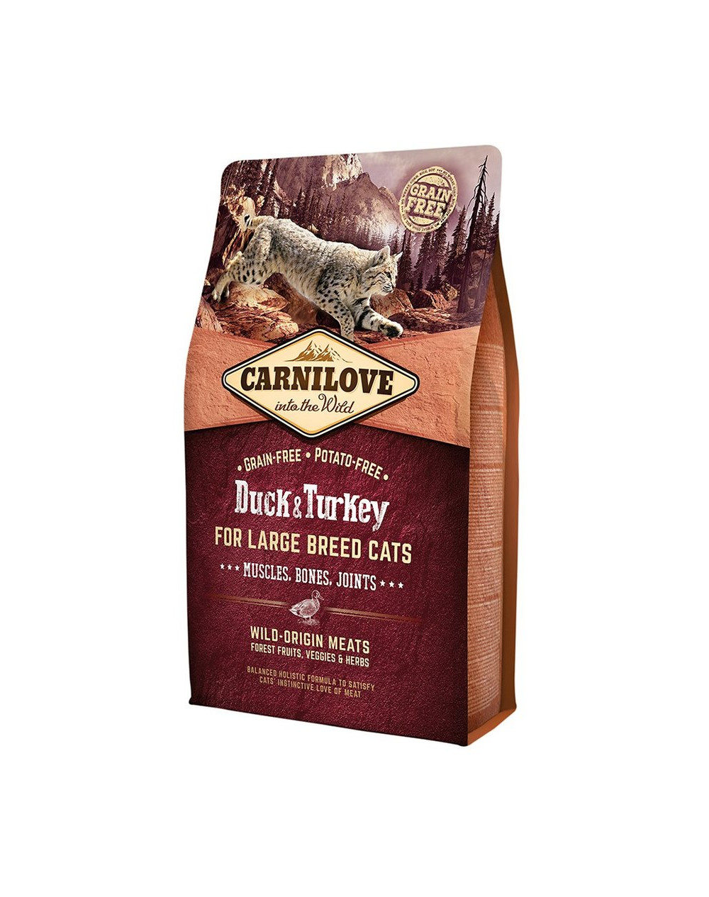 Carnilove Eend & Kalkoen - Graanvrije en aardappelvrije formule voor katten van grote rassen. Ontworpen ter ondersteuning van spieren, botten en gewrichten van grote kattenrassen zoals Maine Coon, American Bobtail, Ragdoll, Savannah, Chausie, Siberische kat, Noorse Boskat of Ocicat. Een complex van goed verteerbare eiwitten met voedingsstoffen, vitamines en natuurlijke antioxidanten voor sterke spieren, botten, pezen en gewrichten. Ter ondersteuning van het immuunsysteem en een gezonde vacht. Om altijd fit te blijven, hebben volwassen katten een eiwitrijk dieet nodig met een uitgebalanceerde hoeveelheid aminozuren. Carnilove Eend & Kalkoen voor katten van grote rassen is ontwikkeld op basis van de natuurlijke samenstelling van kattenvoeding. Kalkoen en eend bevatten een hoog percentage aan gemakkelijk verteerbare eiwitten en meervoudig onverzadigde vetzuren om de spieren van de kat van nieuwe energie te voorzien. De hogere belasting van het bewegingsapparaat wordt gecompenseerd door de toevoeging van chondroprotectiva en natuurlijke stoffen die de flexibiliteit van de gewrichten en de stabiliteit van banden en pezen bevorderen.