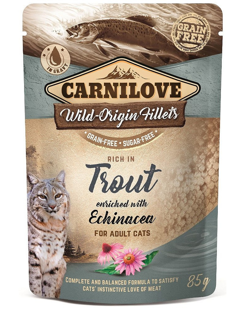Een natvoer voor katten, ontwikkeld met het oog op de gezondheid van katten. Het hoge vleespercentage van kip en forel levert precies de juiste hoeveelheid licht verteerbaar dierlijk eiwit. Het voer is graanvrij en daarom ook geschikt voor katten met voedselallergieën. De in het voer aanwezige echinacea heeft een antivirale, antibacteriële en ontstekingsremmende werking en draagt bij aan het behoud van een gezonde huidconditie.