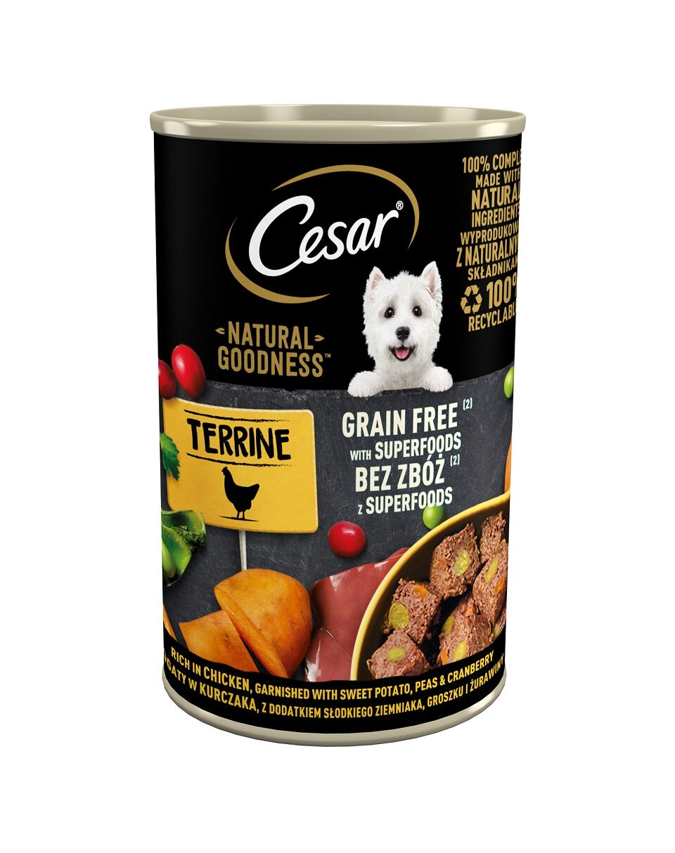 Het kiprijke voer van Cesar Natural Goodness is bereid volgens een zorgvuldig geselecteerd graanvrij recept en voorziet honden van alles wat ze dagelijks nodig hebben. Dit gerecht is perfect voor een dagelijkse, verse en heerlijke maaltijd. U kunt dit voer serveren met droogvoer of als een apart gerecht. Het is rijk aan kip, aangevuld met zoete aardappelen, erwten en cranberry's – kip is een bron van omega-6-vetzuren, zoete aardappelen zijn een bron van kalium en cranberry-extract is een bron van antioxidanten. Cesar Natural Goodness hondenvoer is zo bereid dat de natuurlijke voedingswaarden en heerlijke smaak behouden blijven. Bij de ontwikkeling waren voedingsdeskundigen en dierenartsen van het WALTHAM Institute of Animal Science betrokken.