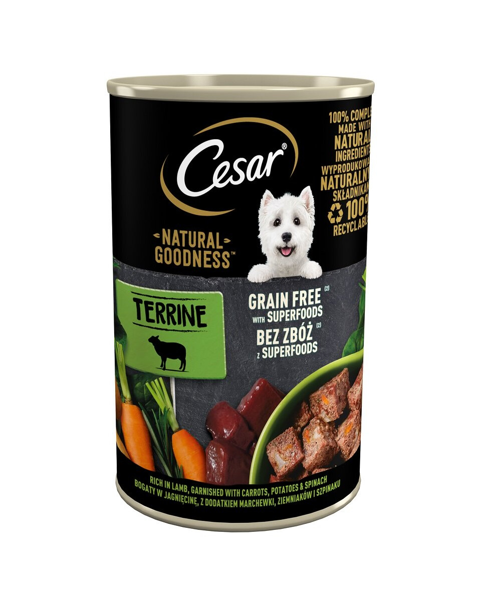Het lamsrijke voer van Cesar Natural Goodness is bereid volgens een zorgvuldig geselecteerd graanvrij recept en voorziet honden van alles wat ze dagelijks nodig hebben. Dit gerecht is perfect voor een dagelijkse, verse en heerlijke maaltijd. U kunt dit voer serveren met droogvoer of als een apart gerecht. Het is rijk aan lamsvlees, aangevuld met wortelen, aardappelen en spinazie – spinazie is een bron van ijzer en kalium en wortelen zijn een bron van antioxidanten. Cesar Natural Goodness hondenvoer is zo bereid dat de natuurlijke voedingswaarden en heerlijke smaak behouden blijven. Bij de ontwikkeling waren voedingsdeskundigen en dierenartsen van het WALTHAM Institute of Animal Science betrokken.