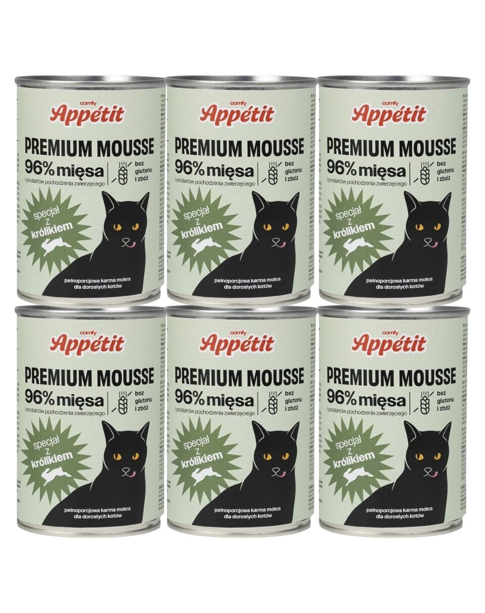 Comfy Appetit Premium Mousse bevat 96% vlees en dierlijke ingrediënten (waarvan 27% konijn), de rest bestaat uit vitamines en mineralen.