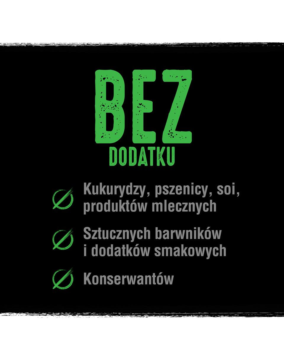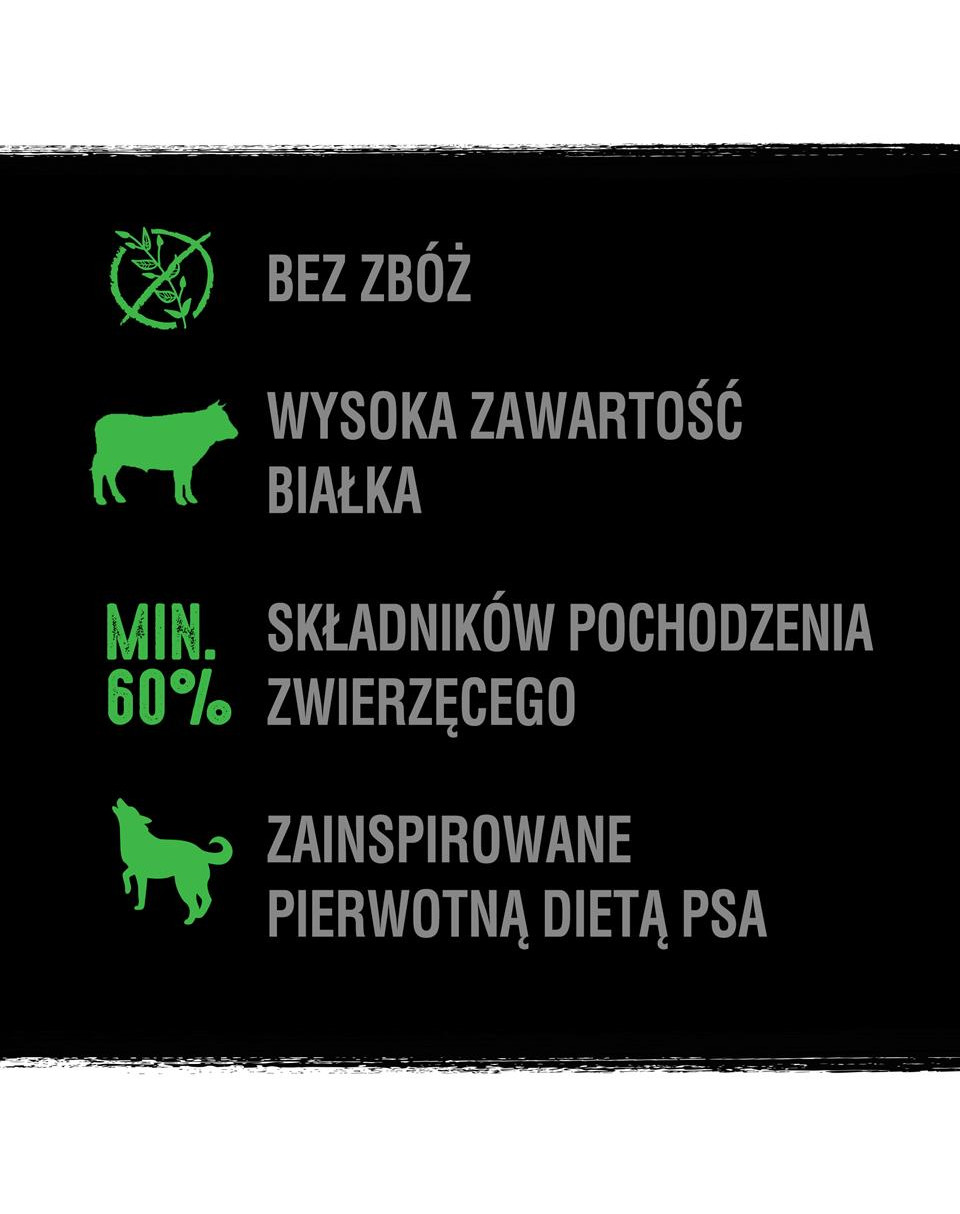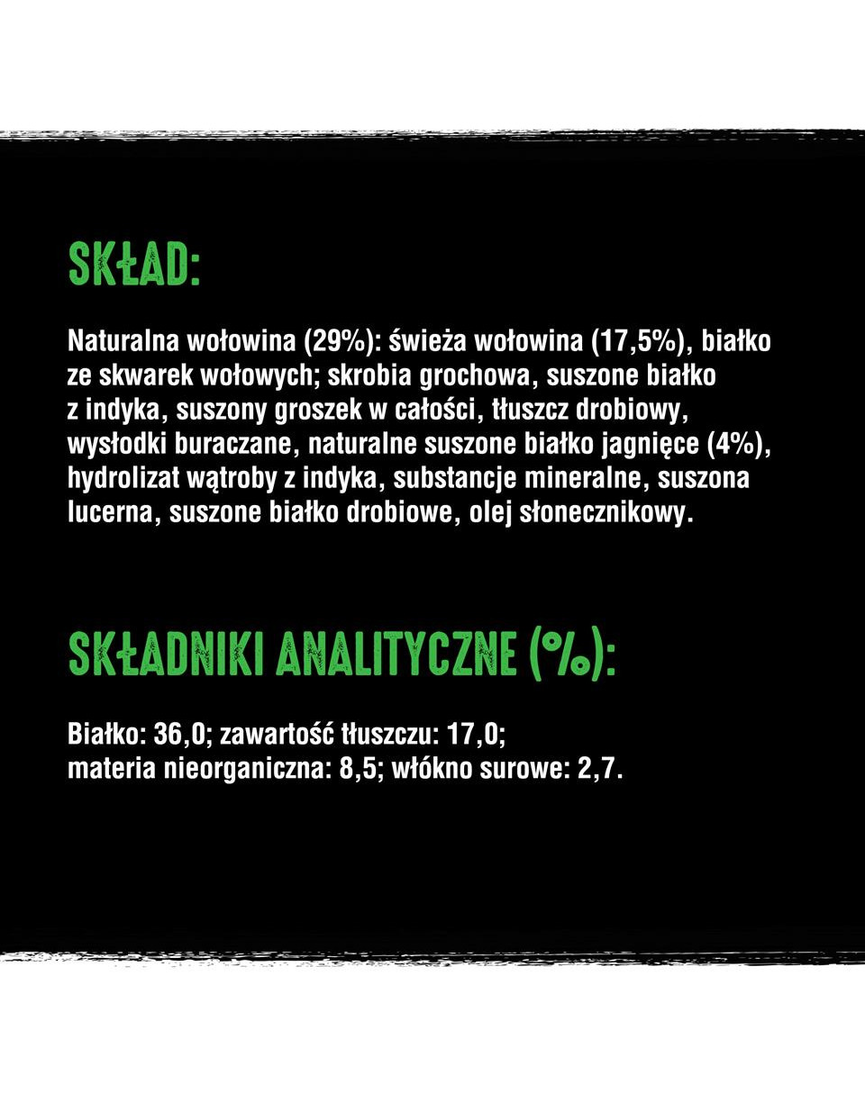 Minimaal 60% dierlijke ingrediënten: Rund 20% (waaronder vers rundvlees (17%), rundvleesgriebenproteïnen (0.7%)), lammeiwit (16%), gedroogd kippeneiwit (16%), gevogeltevet (10%), kalkoeneextract (3%), aardappelvlokken, linzen, erwteneiwit, gedroogde bietensnippers, tapiocazetmeel, mineralen, gedroogde appelsnippers, zonnebloemolie, rozemarijnextract.
