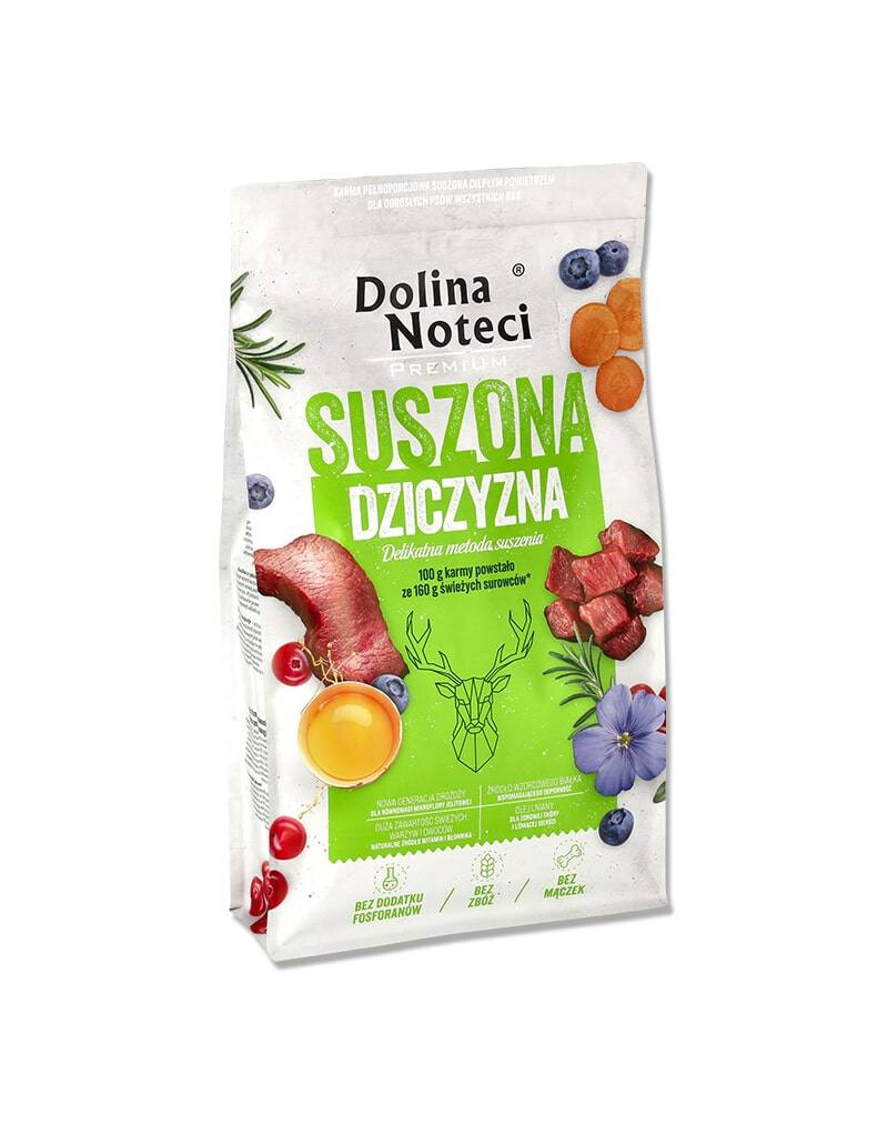 De samenstelling van het voer bestaat voor 80 % uit vlees en organen van wild, rund, varken en kabeljauw, met een uitzonderlijk hoog aandeel van skeletspierweefsel tot 40 %. Het vlees bevat creatine, dat een energiebron voor de spieren vormt en daarom een belangrijk onderdeel van de voeding van de hond is. Het hoge gehalte aan ijzer, B-vitaminen en essentiële aminozuren in wildvlees beïnvloedt de efficiëntie van de stofwisselingsprocessen en draagt bij aan het behoud van een optimale voedingsstatus. Dolina Noteci Premium Wildvlees is een graanvrij product. Psylliumzaad reguleert het spijsverteringskanaal, terwijl veenbessen, bosbessen (met proanthocyanidinen en flavonoïden), wortelen en rozemarijn bioactieve stoffen bevatten die helpen om oxidatieve processen te remmen en zo het verouderingsproces te vertragen.