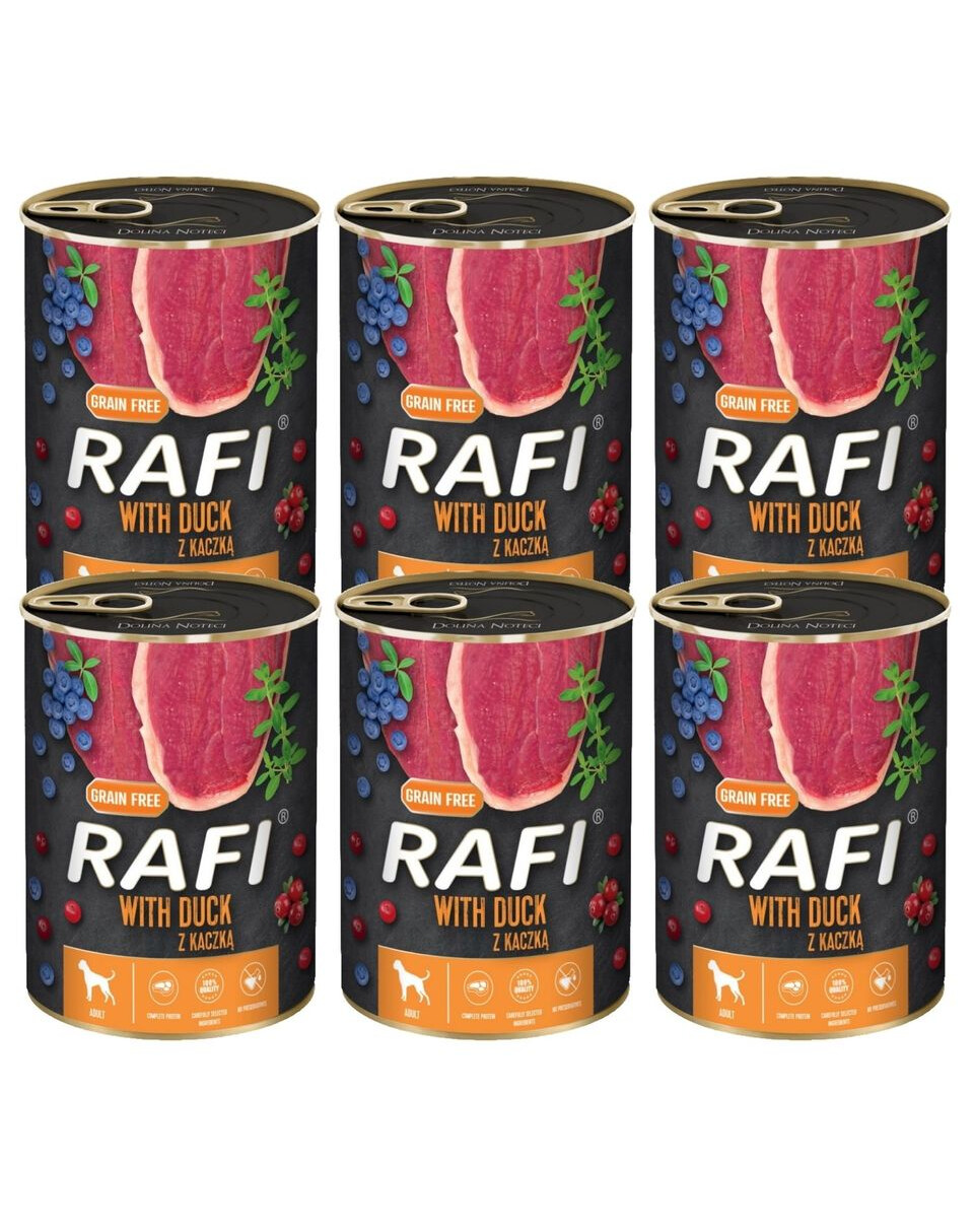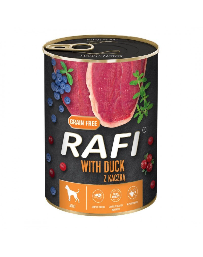 Dit natte hondenvoer van Rafi is dankzij het gebruik van vlees en ingrediënten van dierlijke oorsprong van eenden een bron van volledige eiwitten met alle essentiële aminozuren.