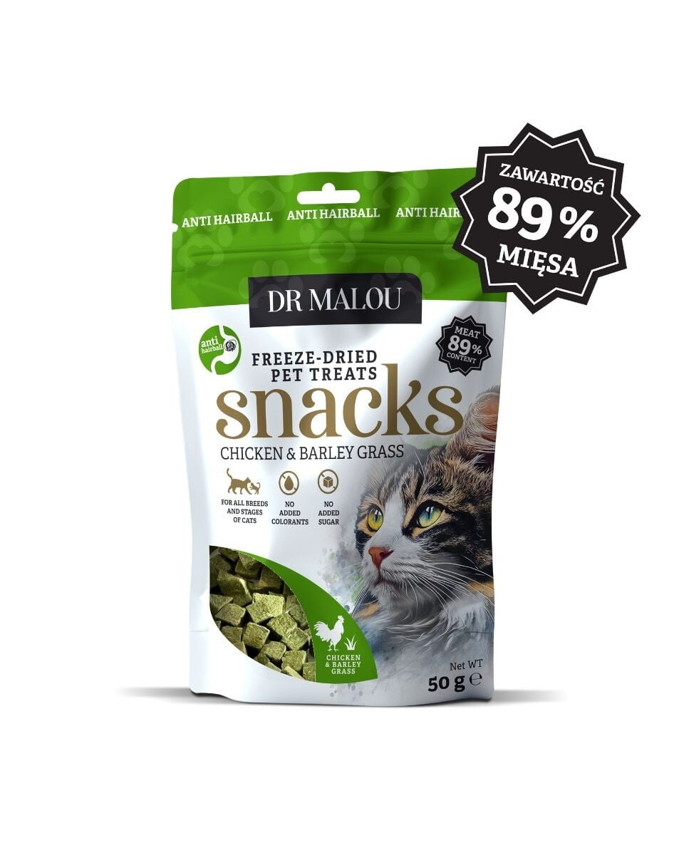 Aanvullend voer voor katten – 100% gevriesdroogde blokjes met kip en gerstegras van Dr Malou