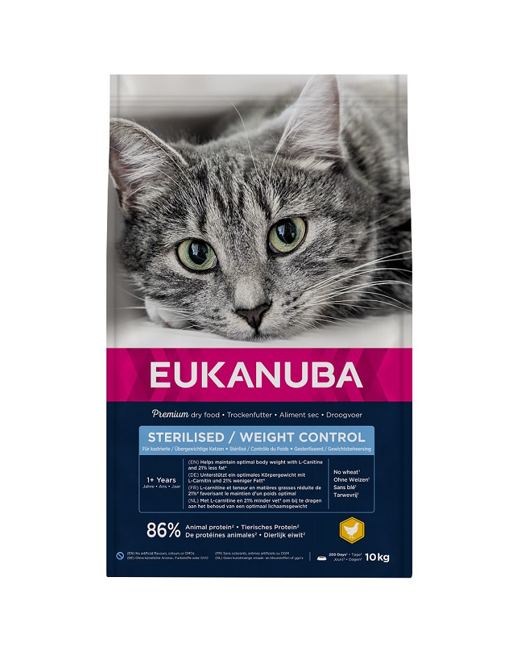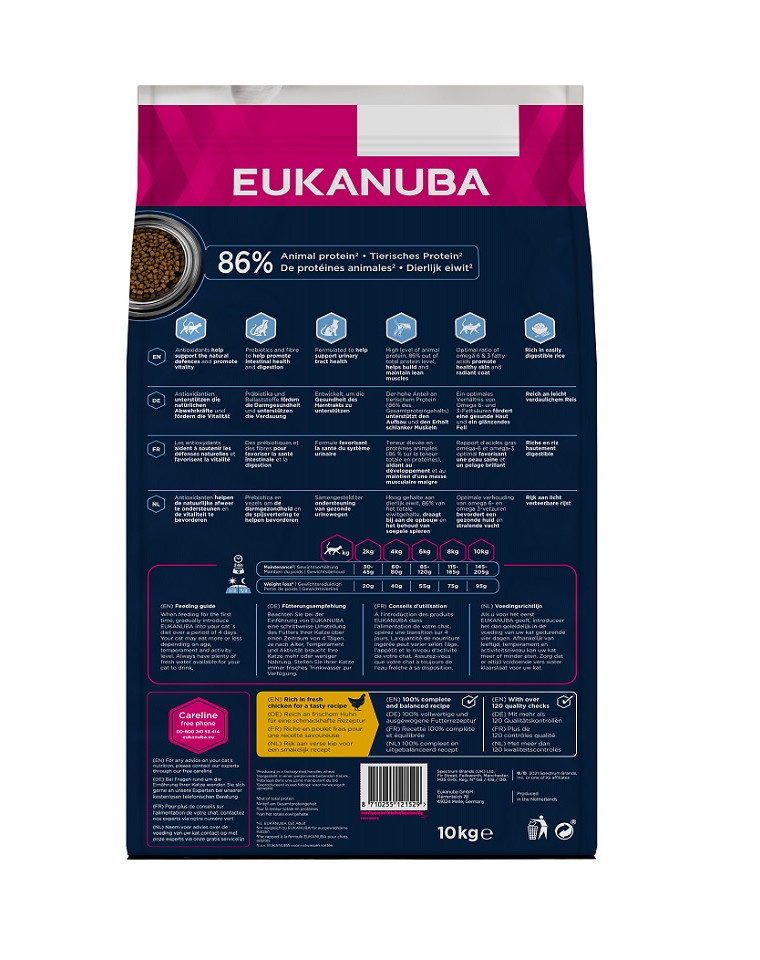 EUKANUBA Droogvoer voor volwassen, gesteriliseerde en overgewichtige katten is 100% compleet en uitgebalanceerd en bevat L-Carnitine. Het vetgehalte is met 21% verlaagd*, wat bijdraagt aan vetverbranding en het behoud van een gezond gewicht. Het eiwit in dit smakelijke voer met vers kippenvlees bestaat voor 86% uit dierlijke eiwitten, die bijdragen aan de opbouw en het behoud van slanke spieren. Het is tarwevrij en bevat veel licht verteerbare rijst, evenals prebiotica en vezels die de spijsvertering en de gezondheid van de spijsvertering bevorderen. Bovendien beschermt dit speciale voer de gezondheid van de urinewegen en antioxidanten versterken de natuurlijke afweer en vitaliteit. De optimale verhouding van Omega-6- en Omega-3-vetzuren ondersteunt een gezonde huid en een glanzende vacht. EUKANUBA Droogvoer voor volwassen gesteriliseerde en overgewichtige katten is smakelijk en bevat geen kunstmatige aroma's, kleurstoffen of GGO's.