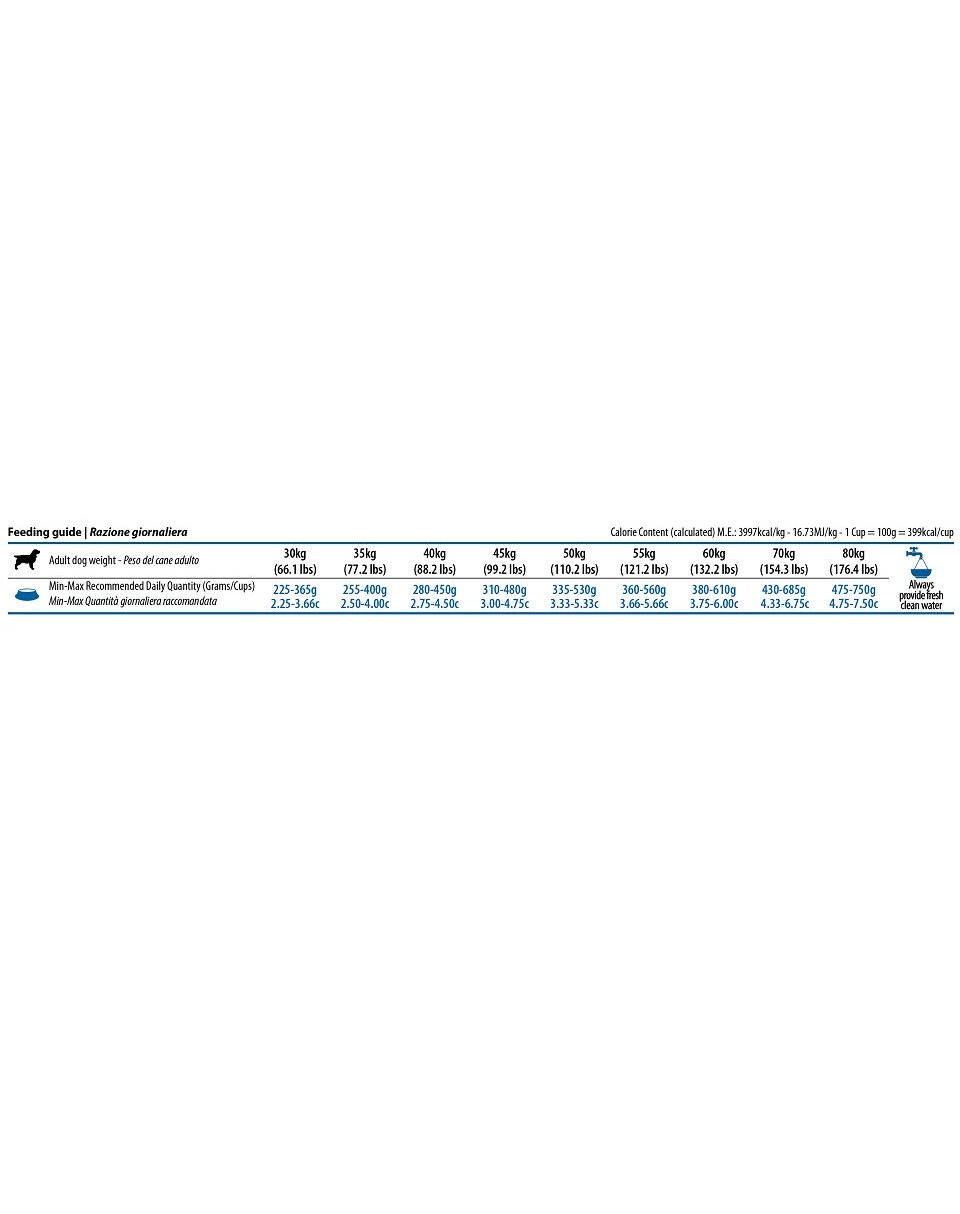 Ruw eiwit 30,00%, Ruw vet 18,00%, Ruwe vezels 2,90%, Vocht 9,00%, Ruwe as 6,80%, Calcium 0,90%, Fosfor 0,80%, Omega-6 3,30%, Omega-3 0,90%, DHA 0,50%, EPA 0,30%, Glucosamine 1200mg/kg, Chondroitinesulfaat 900mg/kg.
