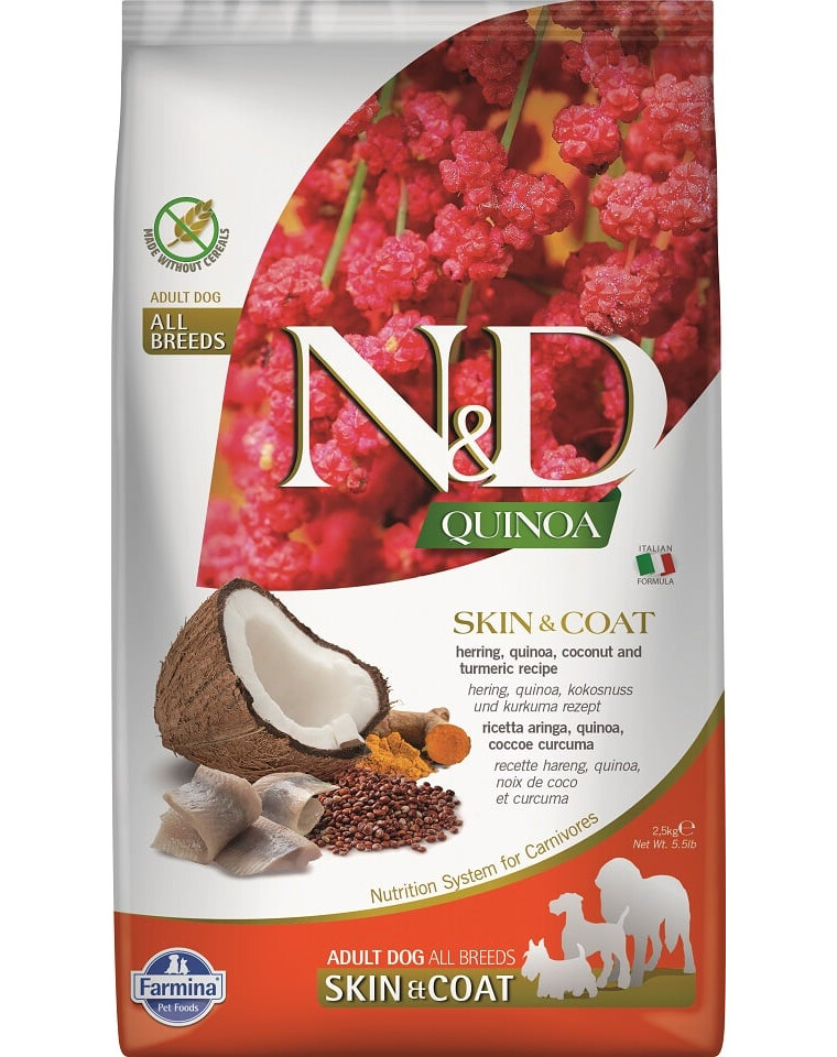 Farmina N&D Quinoa Skin & Coat ist ein diätetisches Alleinfuttermittel für Hunde, das zur Reduzierung von Unverträglichkeiten gegenüber Inhaltsstoffen und Nährstoffen empfohlen wird.