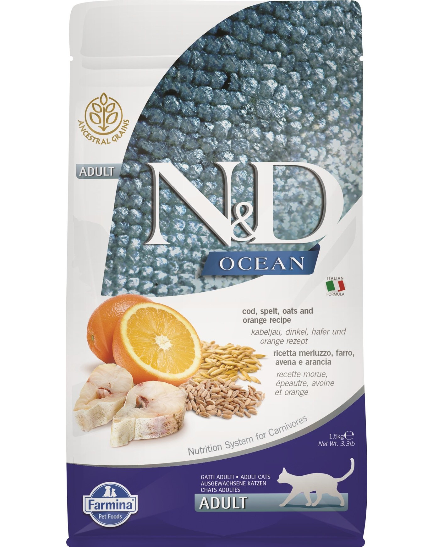 Kabeljauw (27 %), gedehydrateerd kabeljauw eiwit (26 %), visolie (uit haring), spelt (10 %), haver (10 %), gedroogde bietenpulp, gedroogde wortelen, luzerne meel, chicorei-inuline, fructo-oligosacchariden, gistextract (bron van mannan-oligosacchariden), gedroogde sinaasappel (0,5 %), gedroogde appel, gedroogde granaatappel, gedroogde spinazie, psylliumzaad en schalen (0,3 %), gedroogde bosbessen, natriumchloride, gedroogde biergist, kurkuma (0,2 %), aloë-extract.