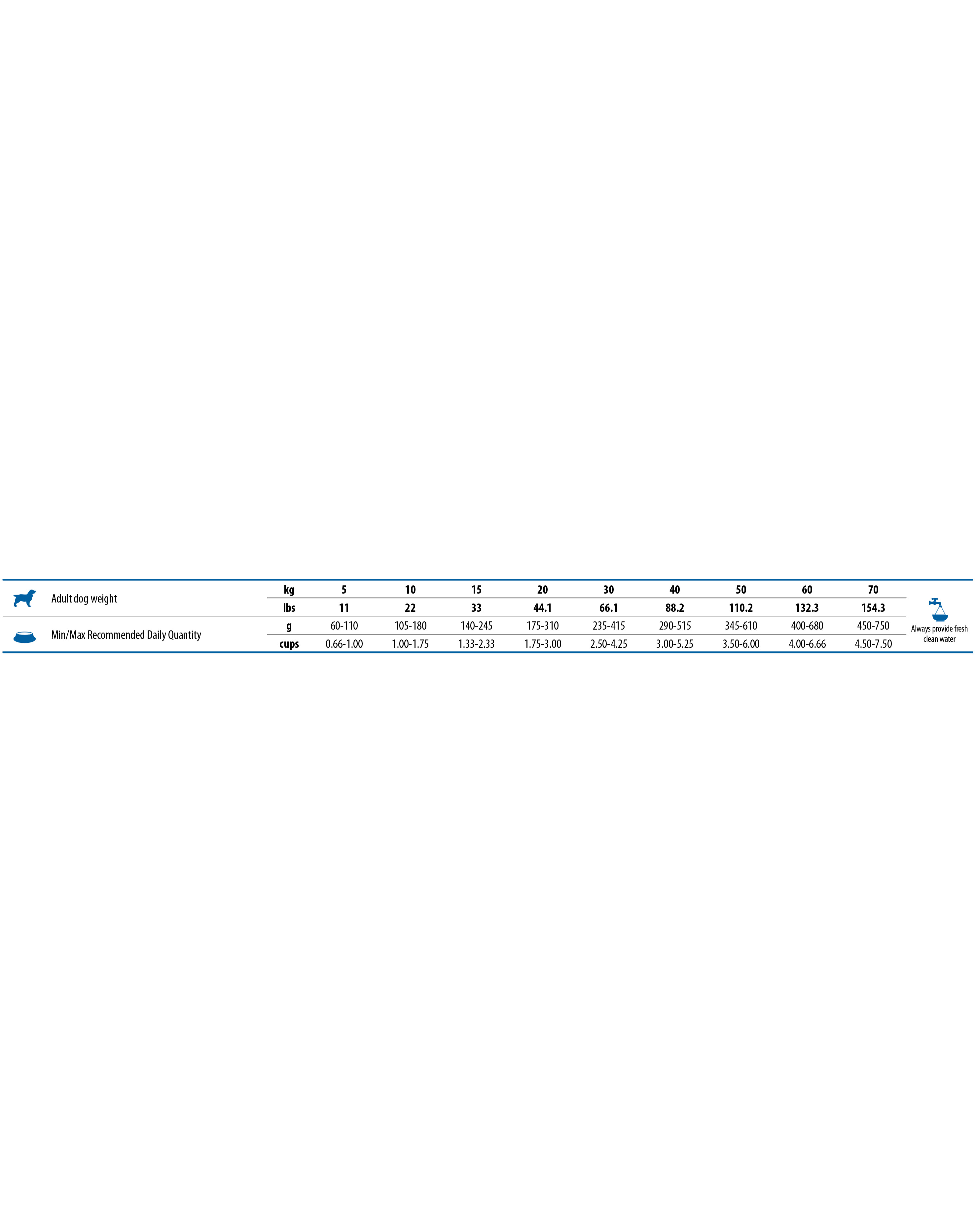 Ruw eiwit 25,00 %; Ruw vet 12,00 %; Ruwe vezel 1,90 %; Vocht 9,00 %; Ruwe as 7,50 %; Calcium 0,90 %; Fosfor 0,60 %; Natrium 0,40 %; Kalium 0,60 %; Magnesium 0,09 %; Omega-6-vetzuren 1,90 %; Omega-3-vetzuren 0,40 %; DHA 0,20 %; EPA 0,15 %; Glucosamine 1200 mg/kg; Chondroïtinesulfaat 900 mg/kg.