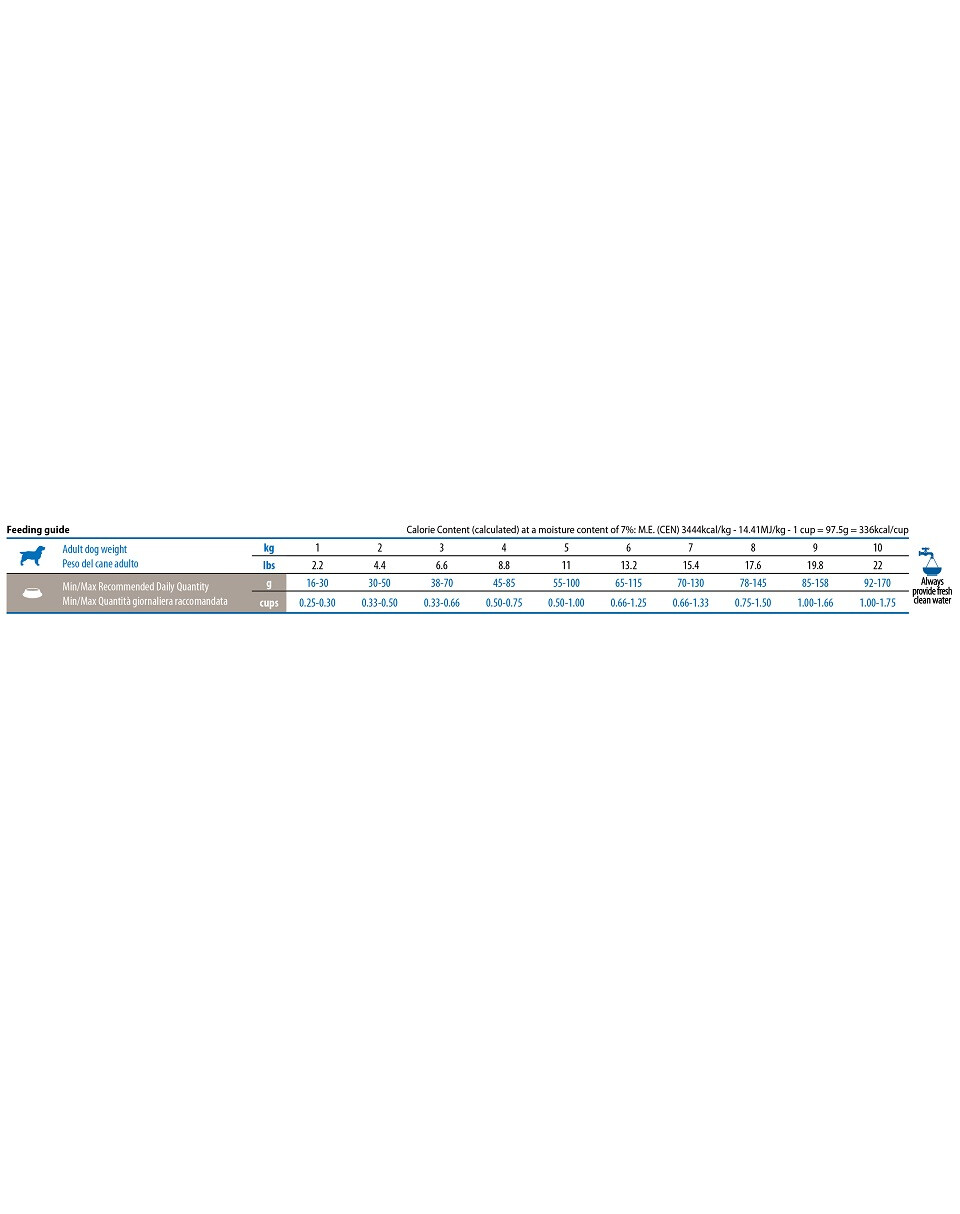 Ruw eiwit 30,00 %; Ruw vet 11,00 %; Ruwe vezel 5,70 %; Vocht 9,00 %; Ruwe as 7,80 %; Calcium 1,20 %; Fosfor 0,90 %; Kalium 0,60 %; Natrium 0,35 %; Magnesium 0,10 %; Omega-6-vetzuren 2,00 %; Omega-3-vetzuren 0,30 %; DHA 0,10 %; EPA 0,05 %; Glucosamine 1200 mg/kg; Chondroitinesulfaat 900 mg/kg.