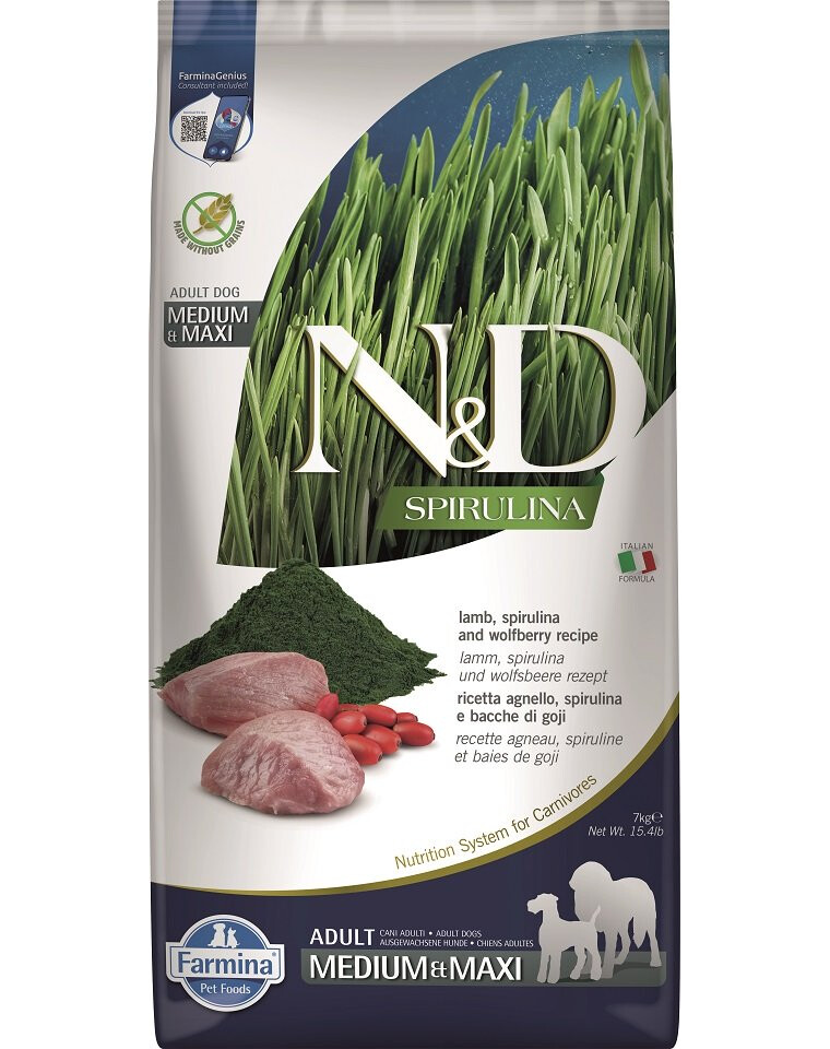 Alleinfuttermittel voor volwassen honden van middelgrote en grote rassen met lamsvlees, spirulina en goji-bessen.