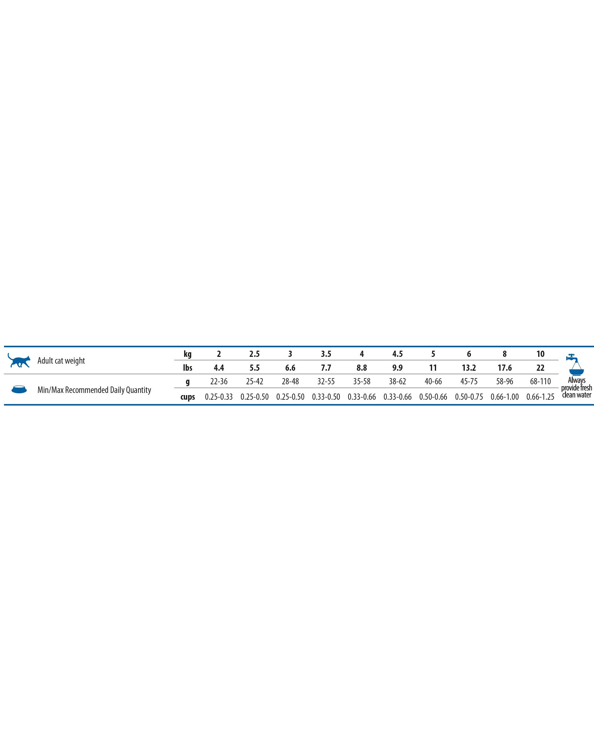 Ruw eiwit 44,00%; Ruw vet 20,00%; Ruwe vezel 1,80%; Vocht 8,00%; Ruwe as 8,50%; Calcium 1,00%; Fosfor 0,90%; Magnesium 0,08%; Omega-6 3,10%; Omega-3 1,40%; DHA 0,80%; EPA 0,50%.
