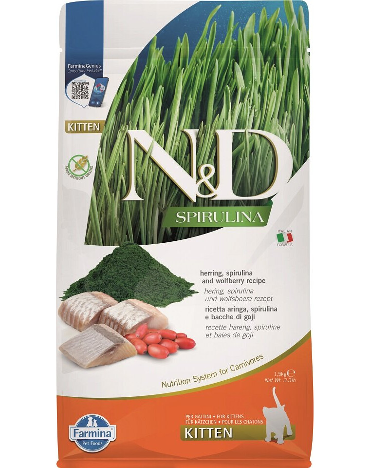 Alleinfuttermittel voor kittens, drachtige en zogende katten met haring, spirulina en goji-bessen.