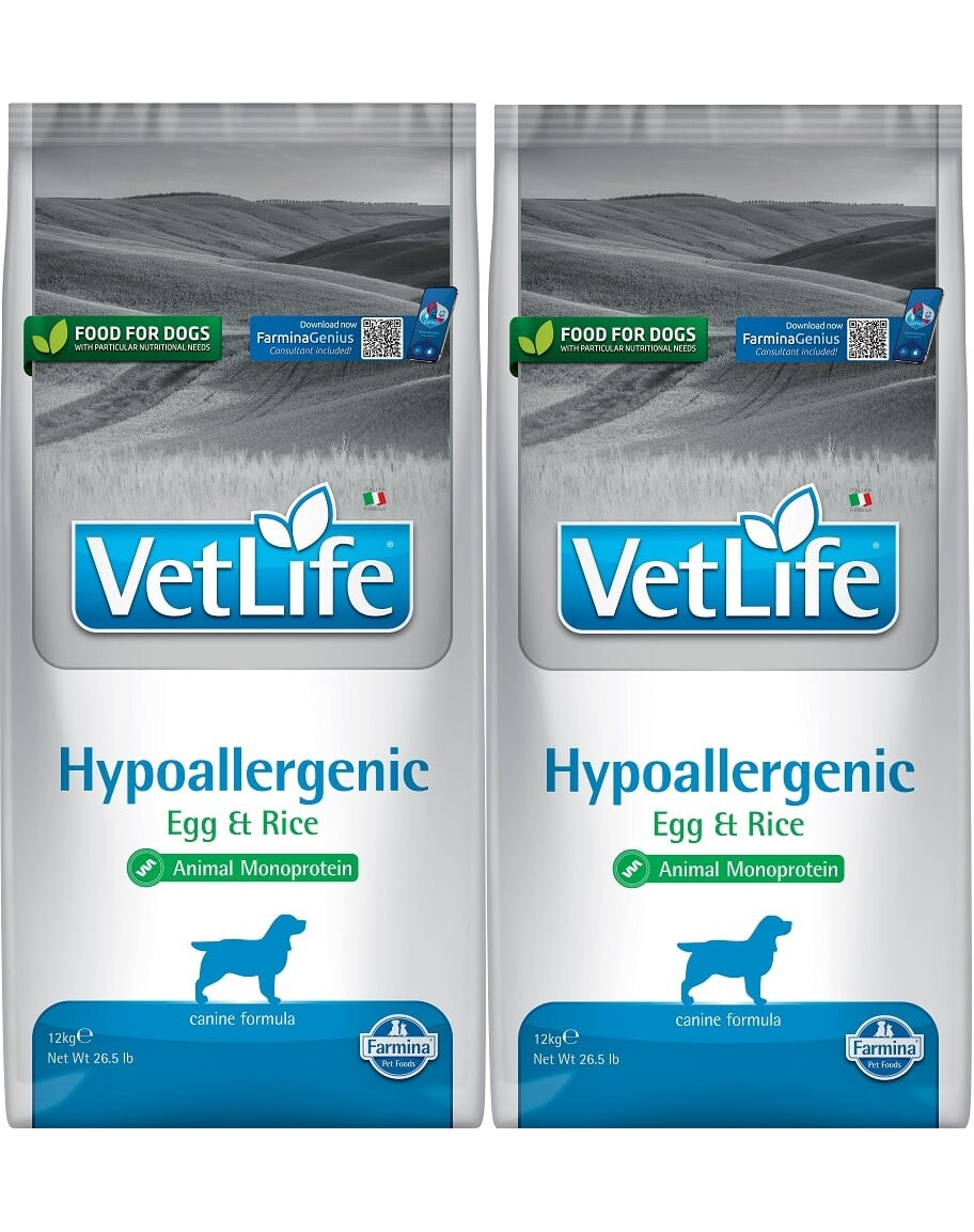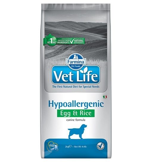 Bij voedselallergieën en -intoleranties. Farmina Vet Life Hypoallergenic Egg & Rice is een dieetvoeding voor volwassen honden, om voedselallergieën en voedselintoleranties te verminderen.